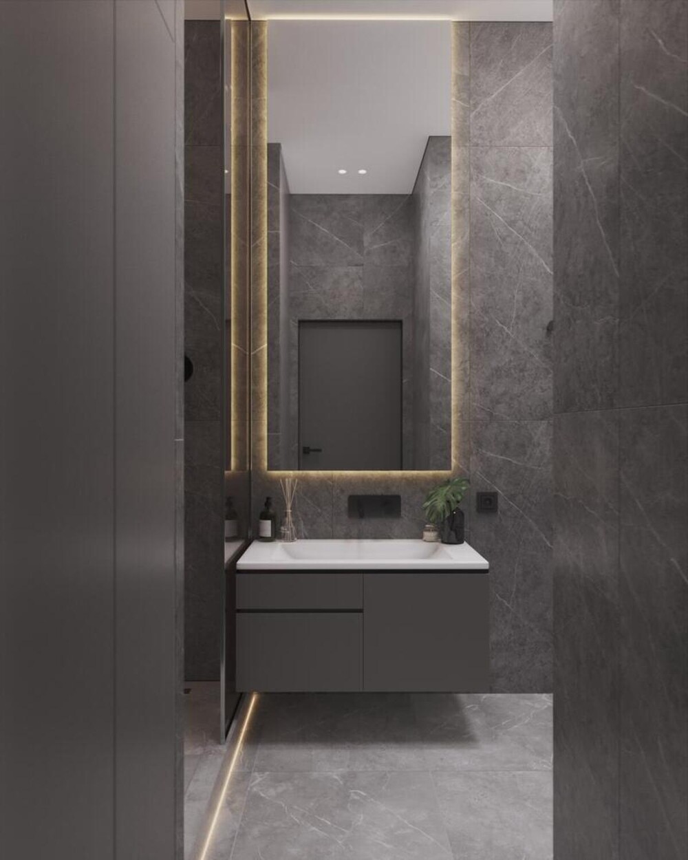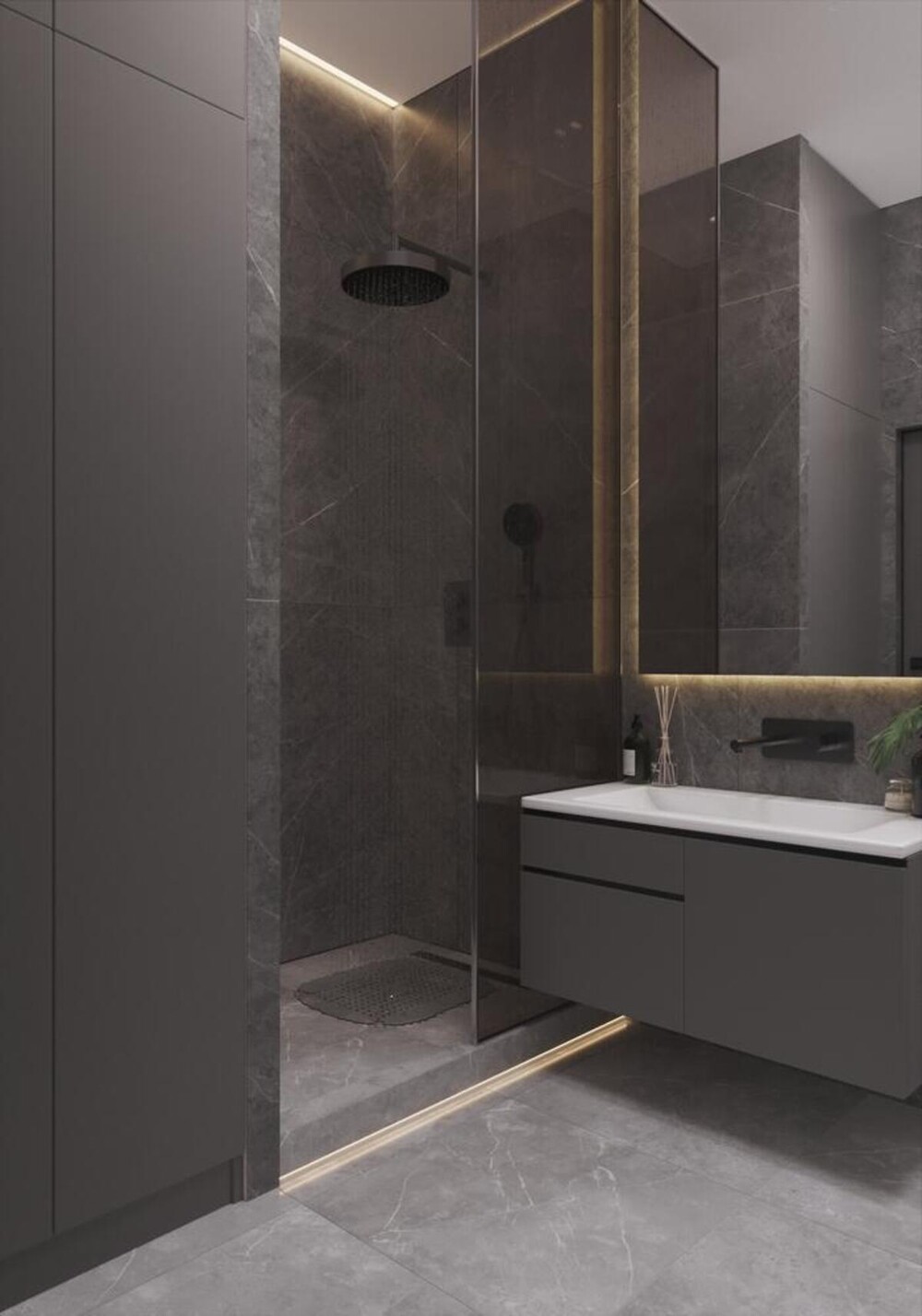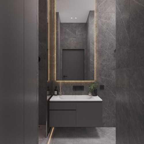 Керамогранит под камень — выбран для влажных зон из-за своей долговечности и легкого ухода.