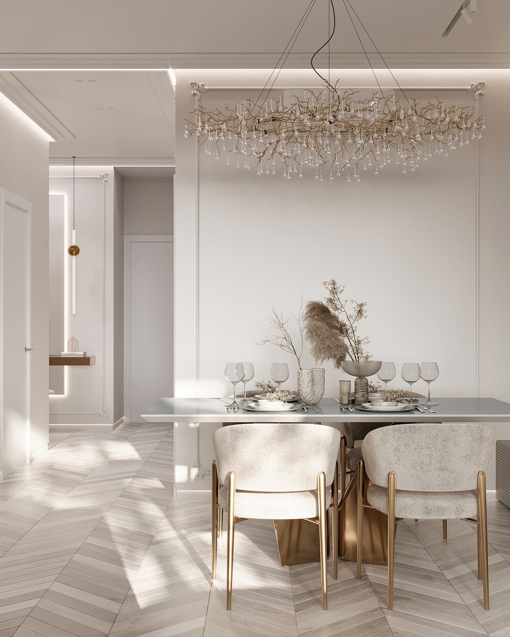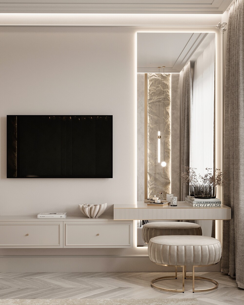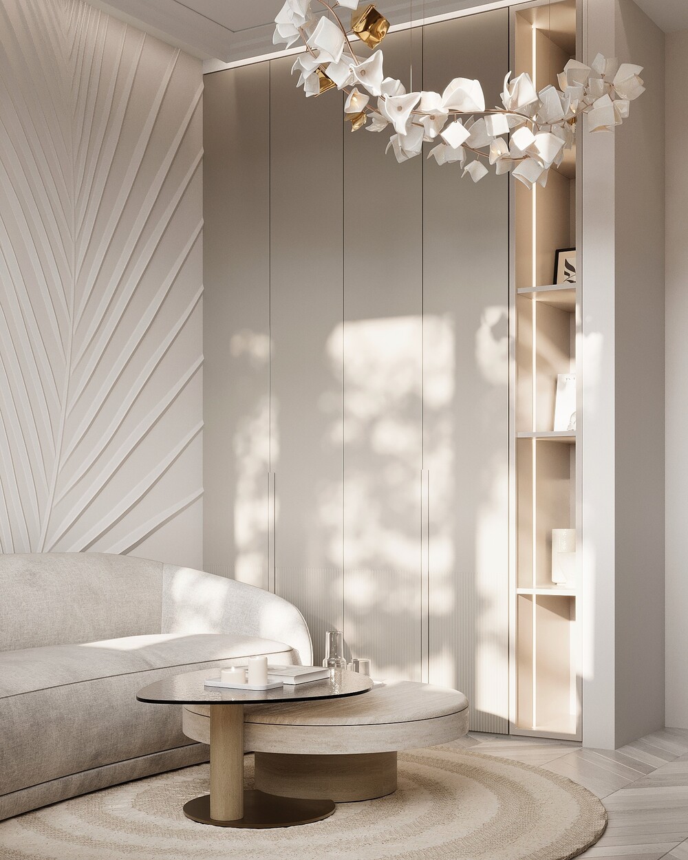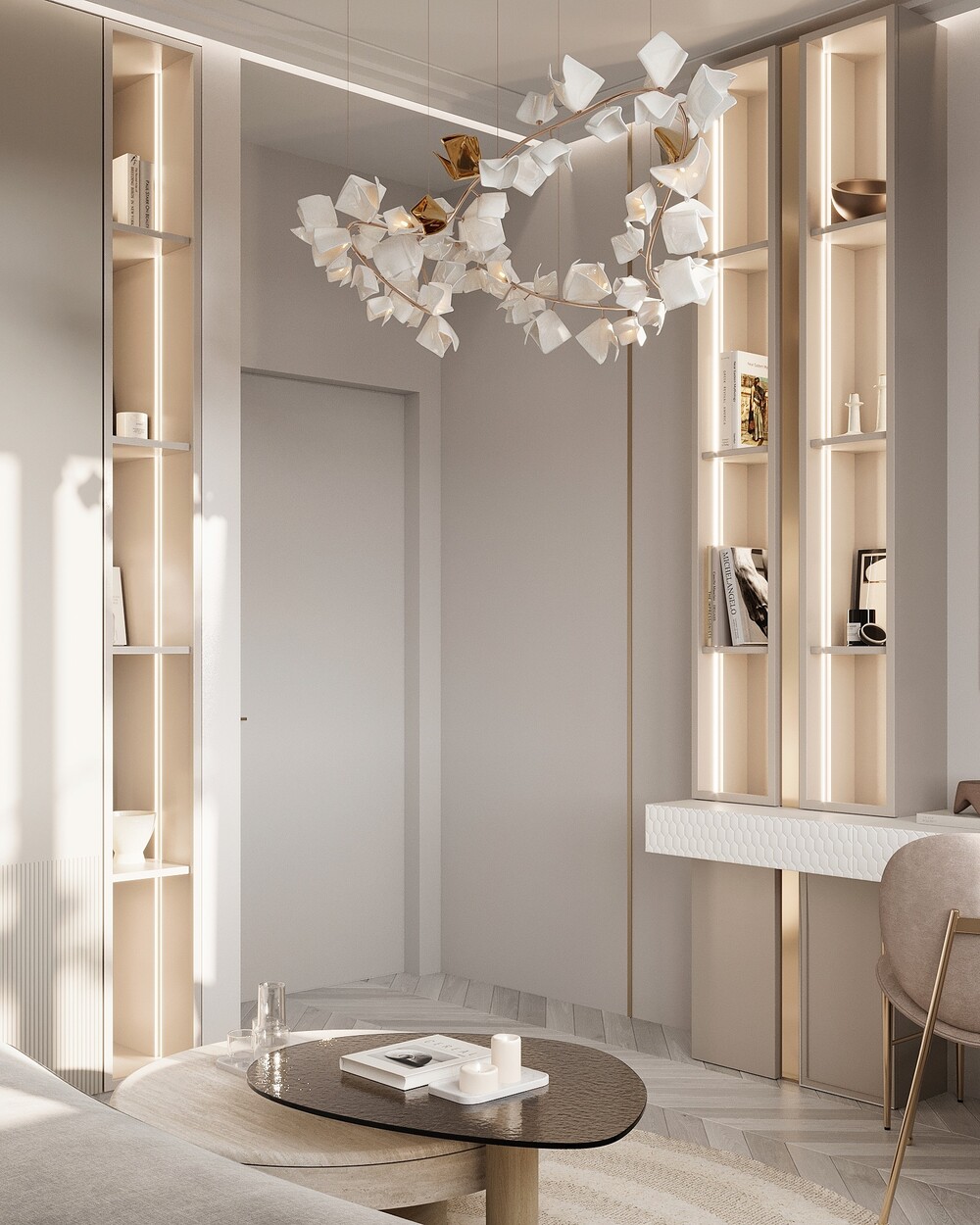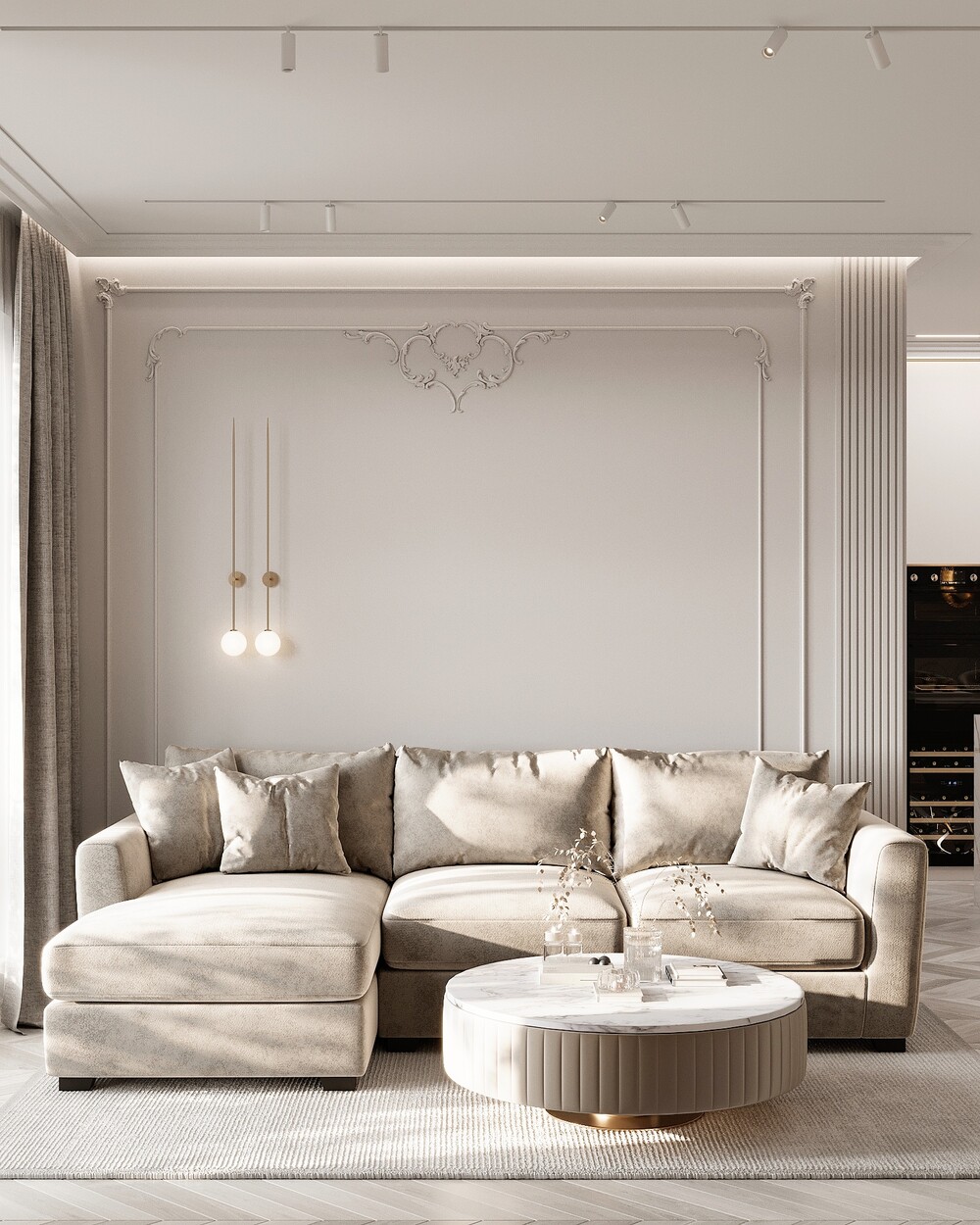 Интерьер базируется на принципах современного минимализма с добавлением классических элементов декора. Основная палитра состоит из белых, пудровых и нюдовых тонов. Латунный декор и металлические вставки используются как связующее звено, проходящее через все помещения квартиры.