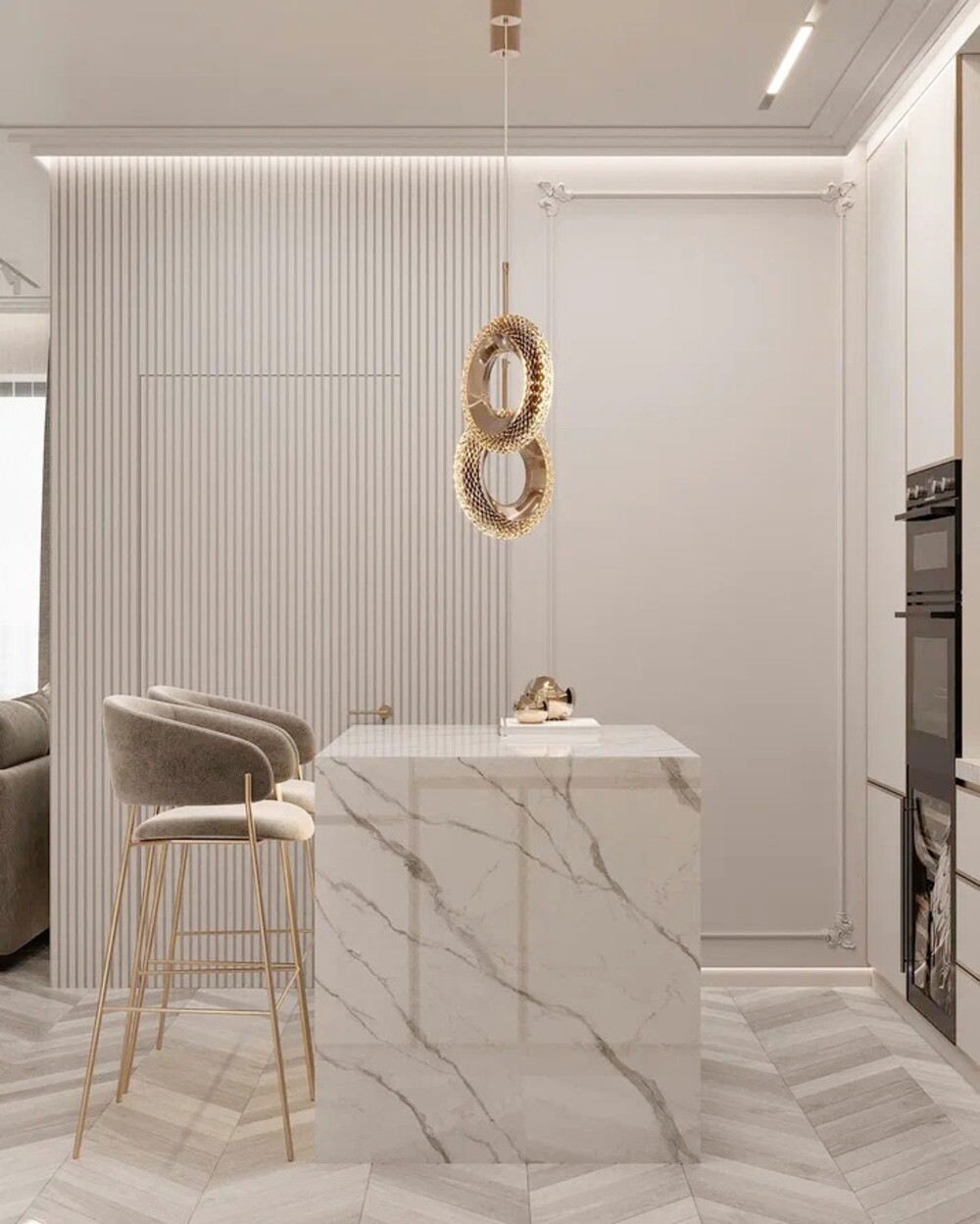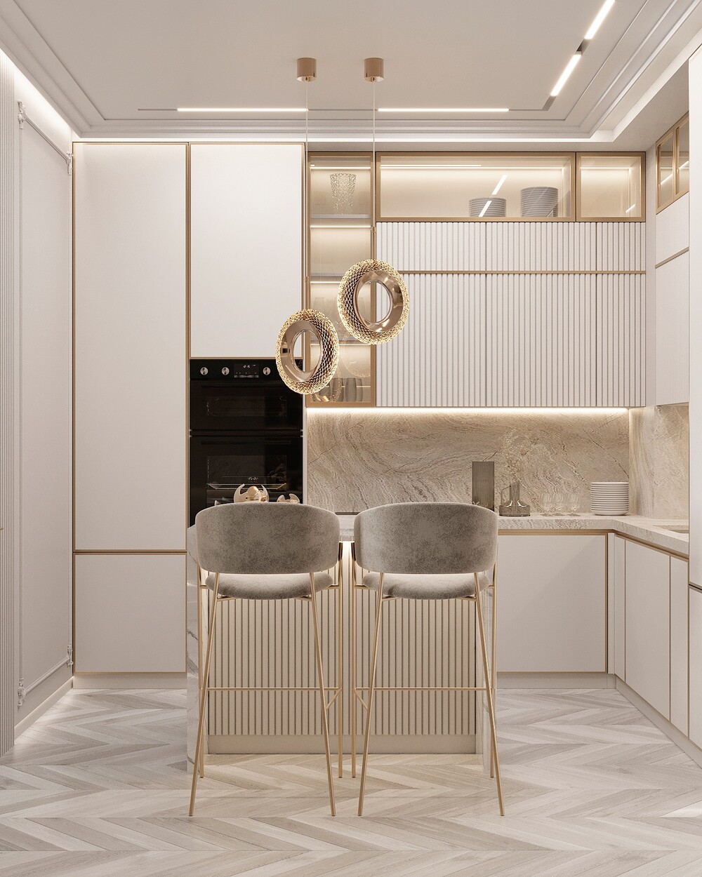 Кухонный гарнитур выглядит монолитно благодаря светлым фасадам и встроенной бытовой технике. Мы добавили тонкие латунные детали в фурнитуру и светильники, чтобы связать зону с остальным интерьером.