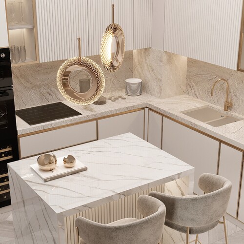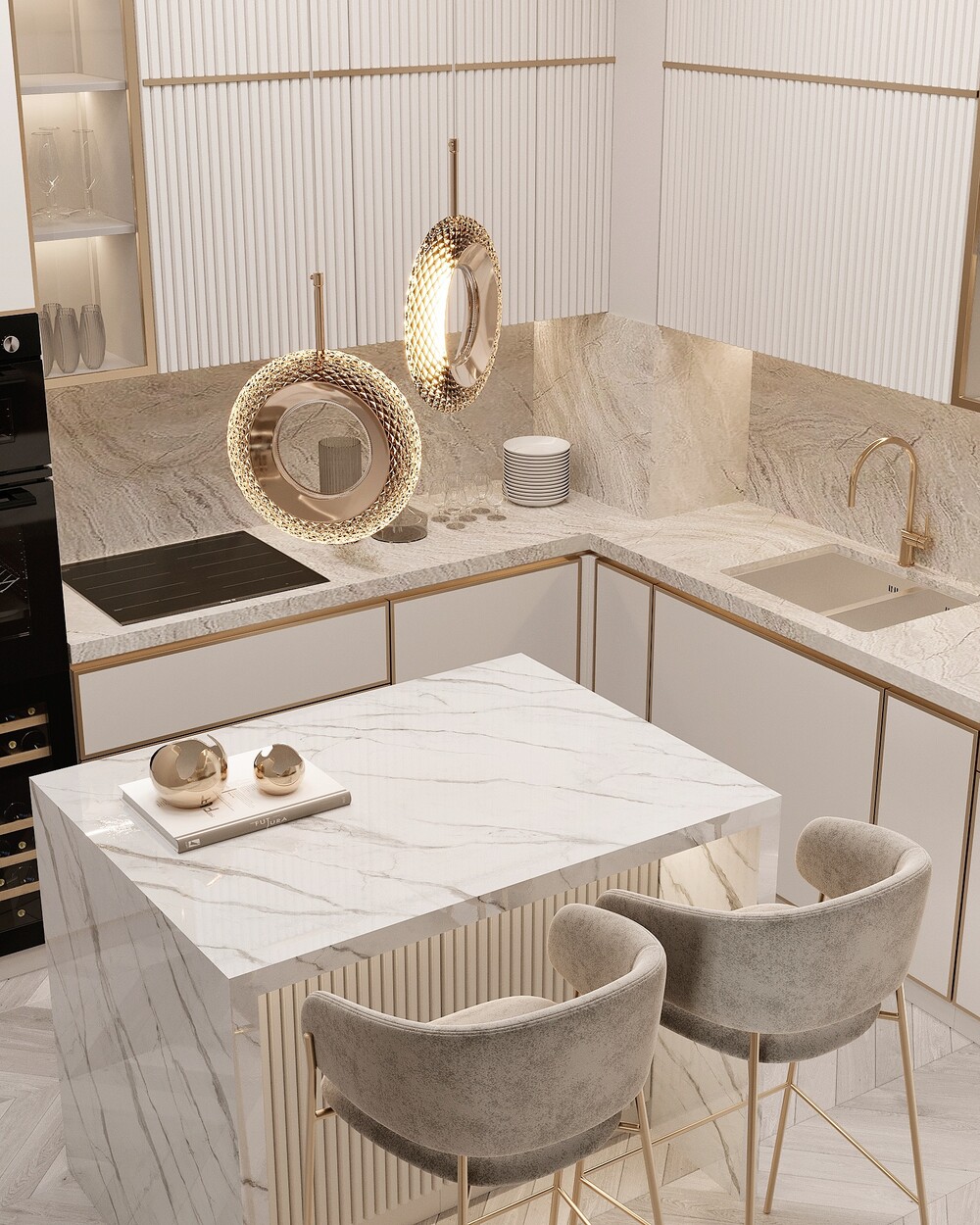Остров с отделкой под камень заменяет рабочую поверхность и подходит для быстрых перекусов. Трековые системы и подсветка верхних модулей позволяют менять интенсивность света в зависимости от времени суток.