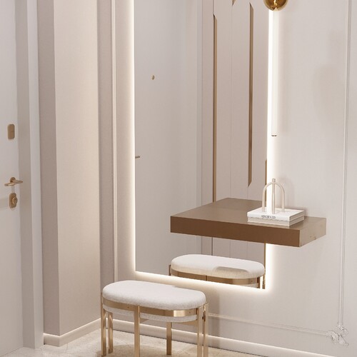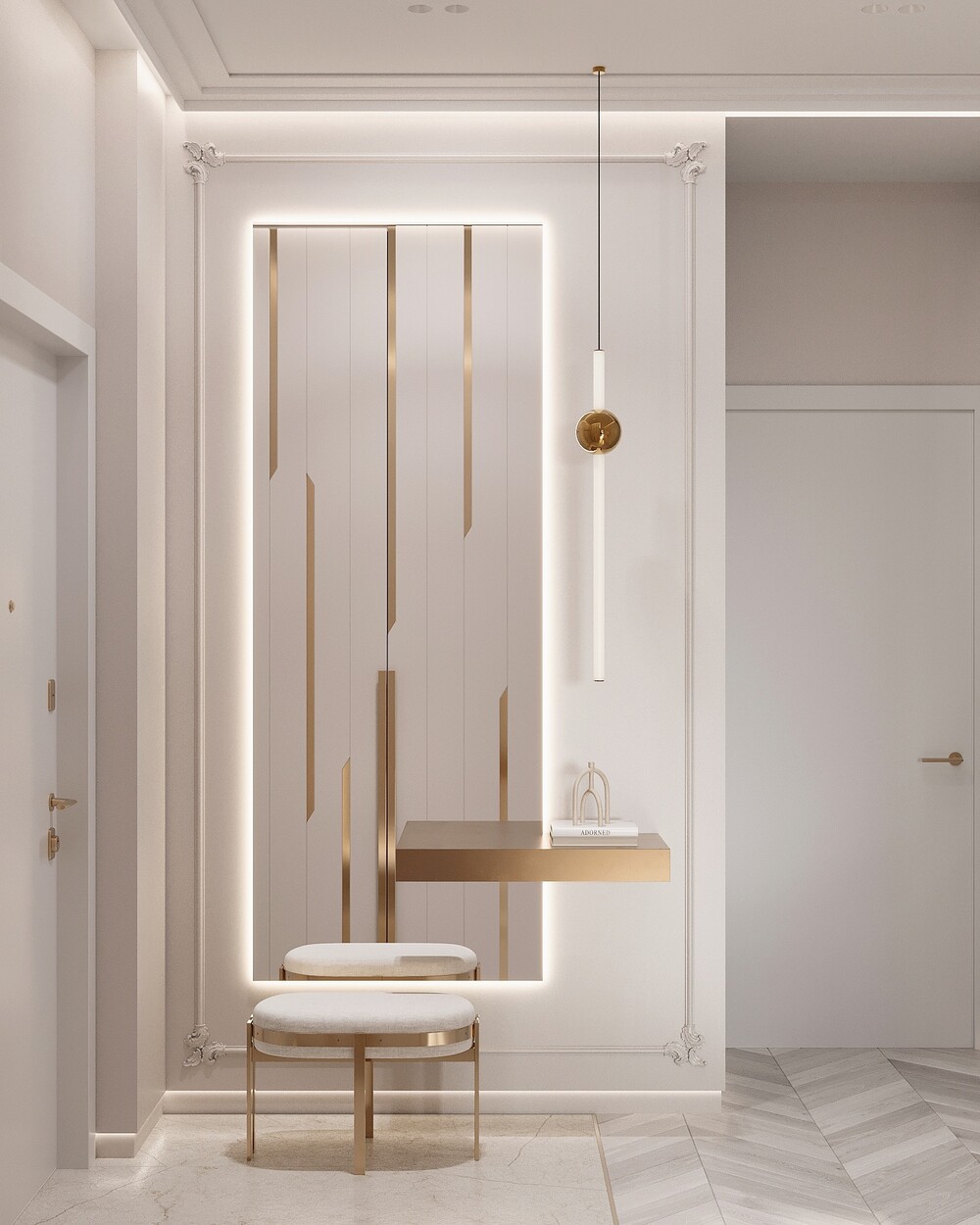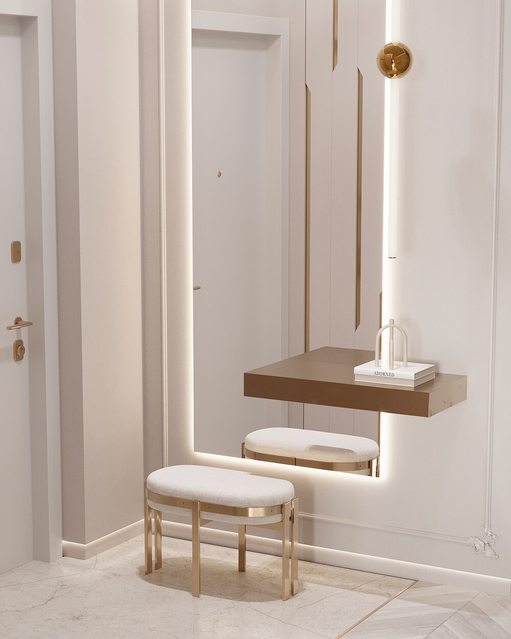 Напротив входа расположена консоль на латунном основании с зеркалом и пуфом для удобства. Скрытые линии света по периметру помогают визуально выровнять геометрию коридора.