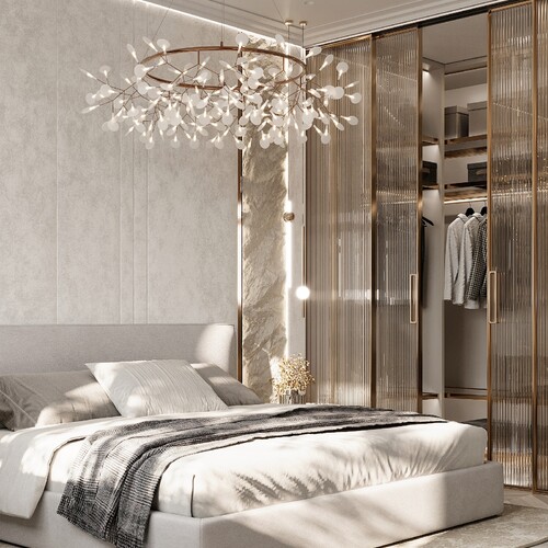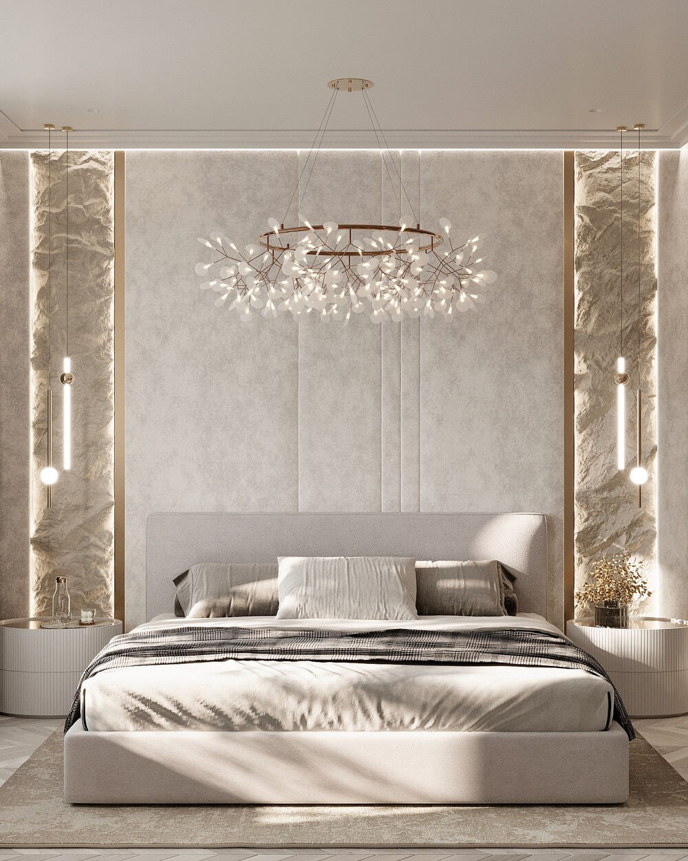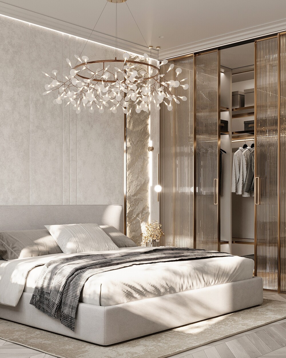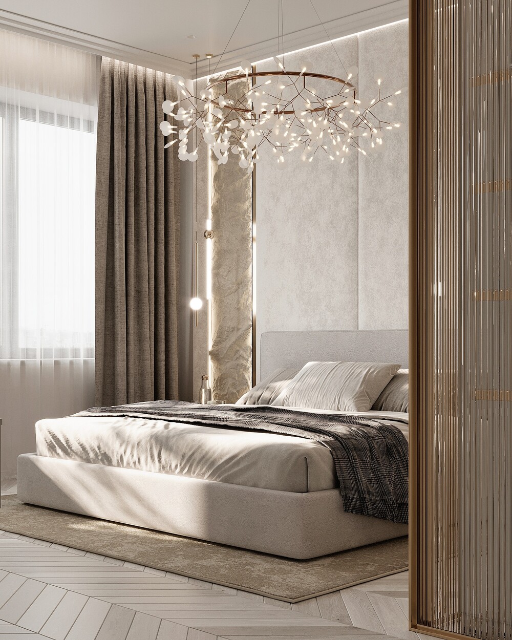В комнате использовали нюдовую гамму, где основной эффект создается за счет сочетания разных материалов. За изголовьем кровати смонтирована стена из декоративных панелей с вертикальными латунными вставками и мягким светом.