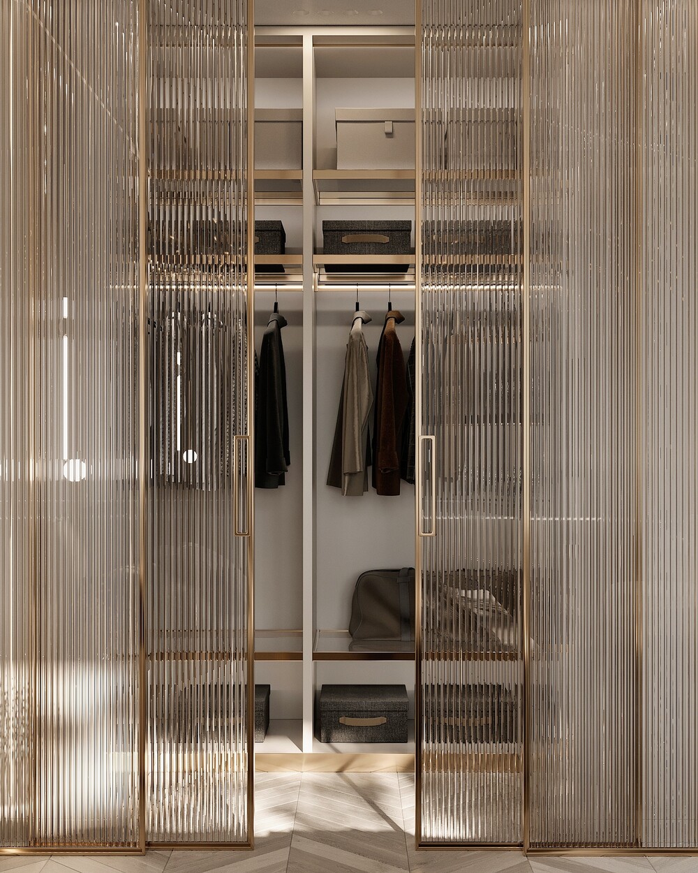 Вместо массивных шкафов мы спроектировали гардеробную со стеклянными рифлеными фасадами в металлической раме. Это решение закрывает вопрос хранения вещей и оставляет ощущение свободного пространства.