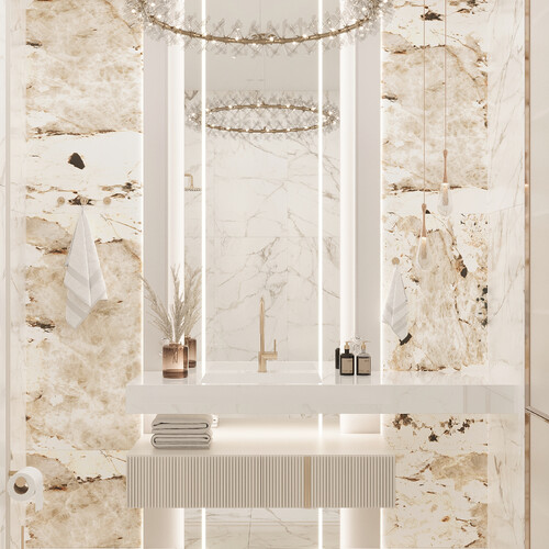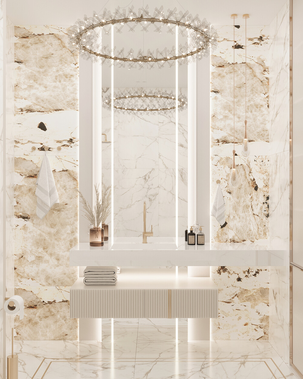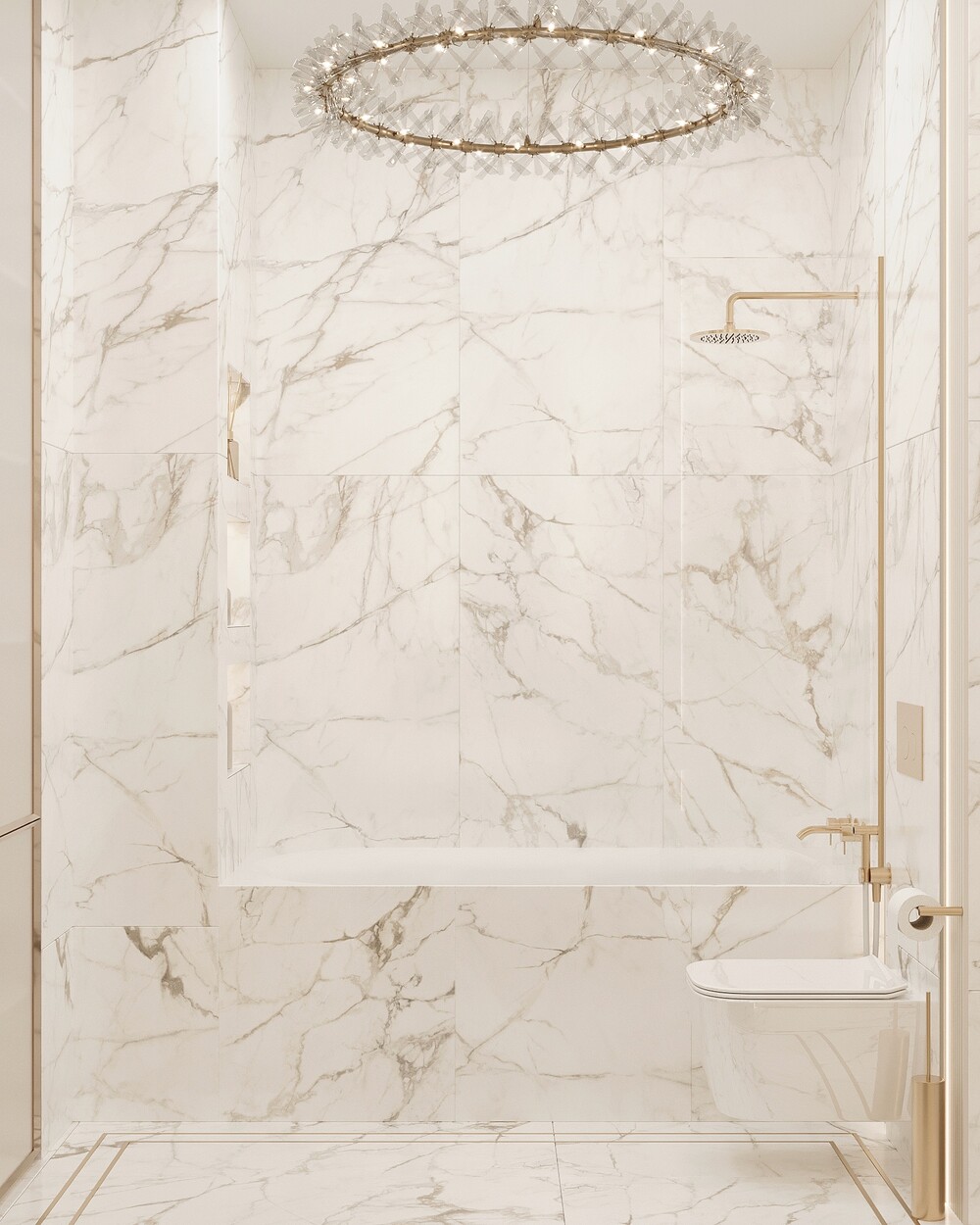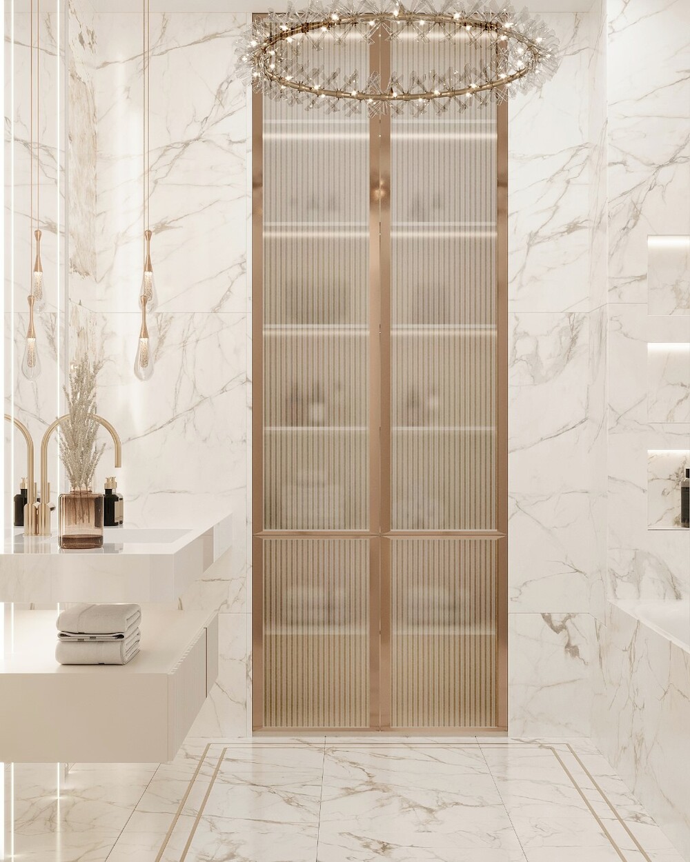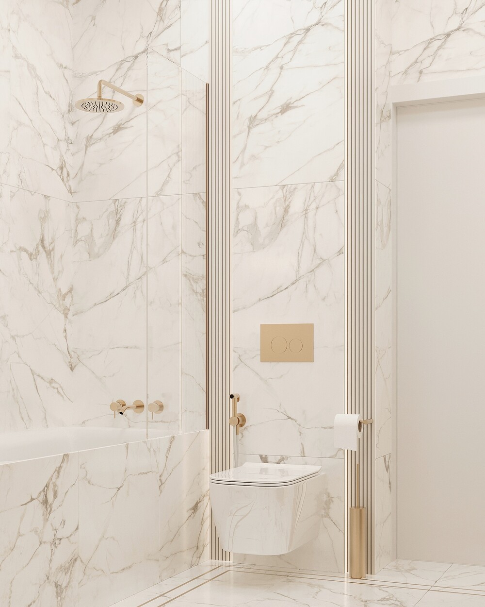 Интерьер ванной построен на сочетании крупноформатного керамогранита под мрамор и латунной сантехники. Стены оформлены плитами с активным рисунком прожилок, который подчеркнут направленным вертикальным светом.