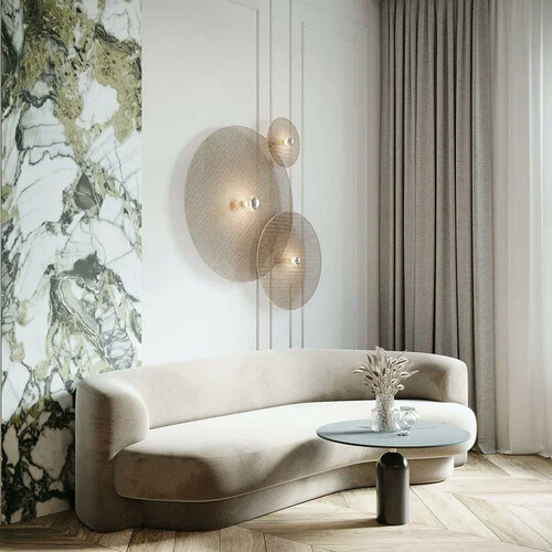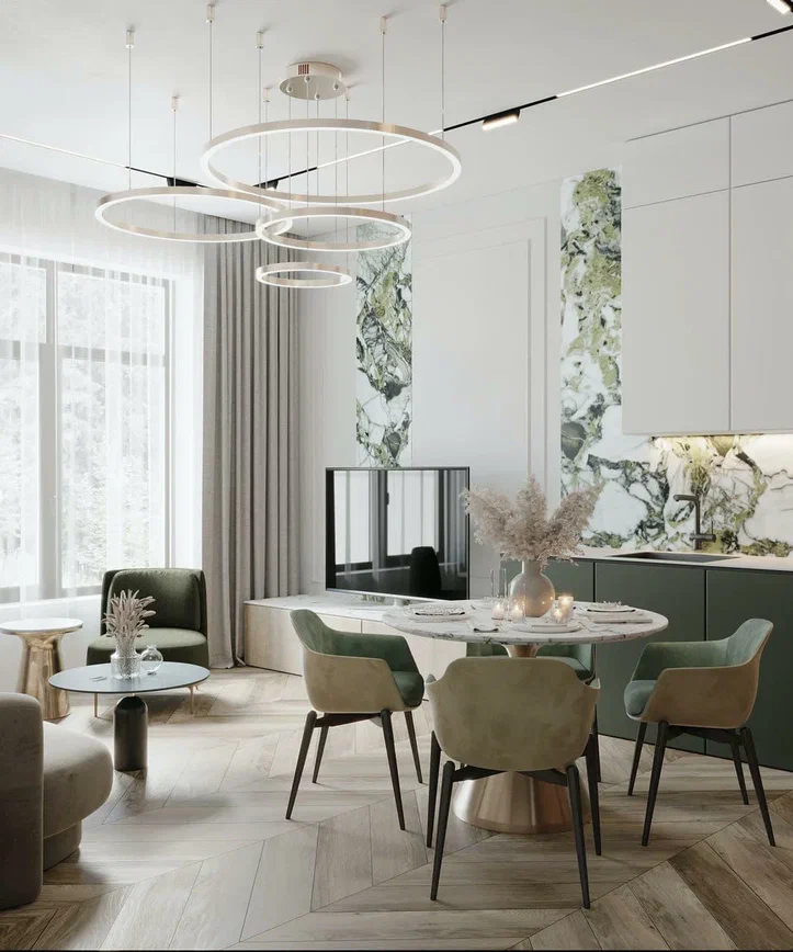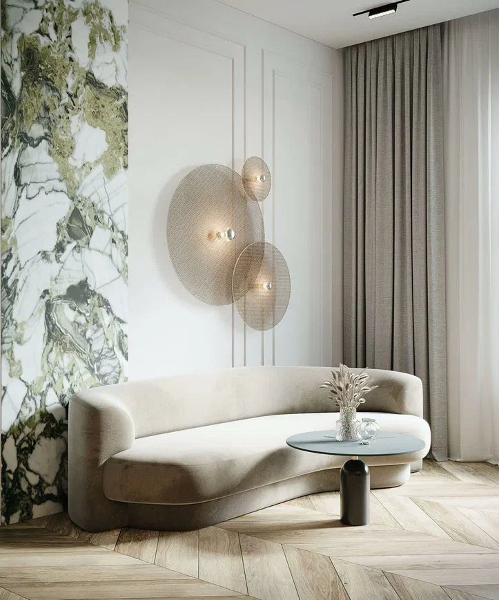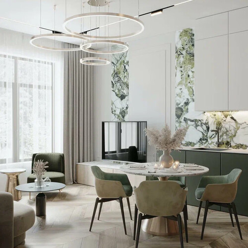 В центре — круглый стол и мягкие кресла на контрастных ножках: композиция выглядит лёгкой и удобной для ежедневных сценариев. Гостиная построена вокруг мягкого дивана округлой формы и небольших журнальных столиков. Освещение многослойное: кольцевые люстры дают общий акцент, а бра добавляют камерности и делают интерьер более выразительным вечером.