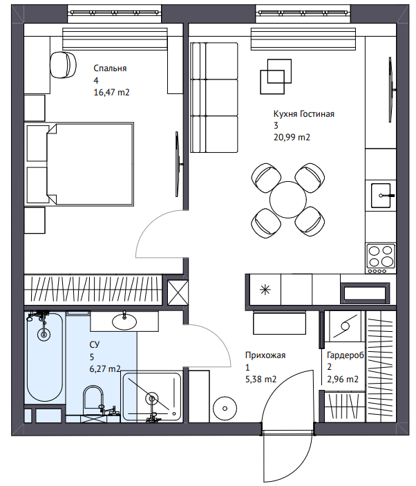 Кухня и гостиная объединены в единое пространство: рабочая линия логично переходит в обеденную зону, а дальше — в мягкую группу у окна. В спальне предусмотрено полноценное место под большую кровать, а также системы хранения вдоль стены, чтобы убрать визуальный шум. Рядом со входом организована гардеробная — она закрывает вопрос верхней одежды, обуви и сезонных вещей. Санузел спланирован максимально функционально: ванна, душевая, раковина, зона хранения и место под стиральную технику.
