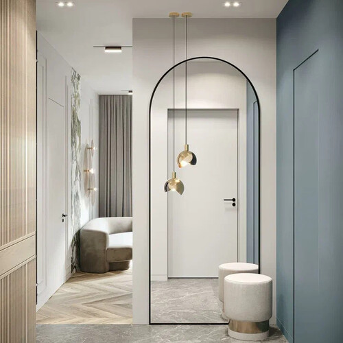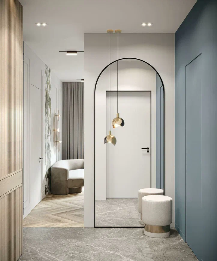 Ремонт квартиры в ЖК RiverSky выполнен в современном стиле с аккуратными классическими акцентами. Основу составляют молочно-белые и тёплые серые тона, которые визуально расширяют помещения. Цветовые акценты — глубокий зелёный и небесно-голубой — используются точечно, через мебель, панели и декоративные элементы, не перегружая интерьер.