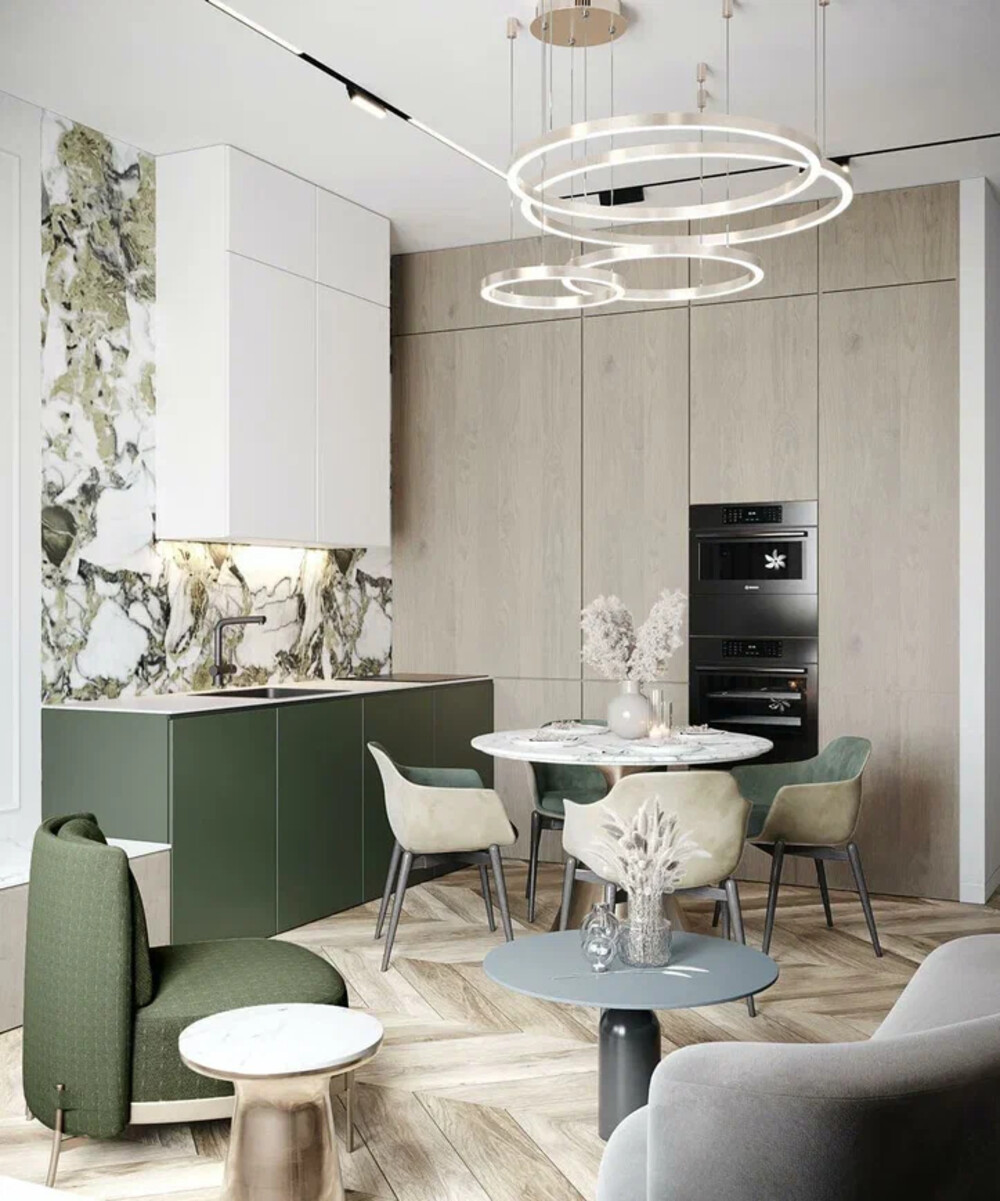 Каменные акценты с зеленой графикой — связывают кухню и гостиную и дают интерьеру характер.