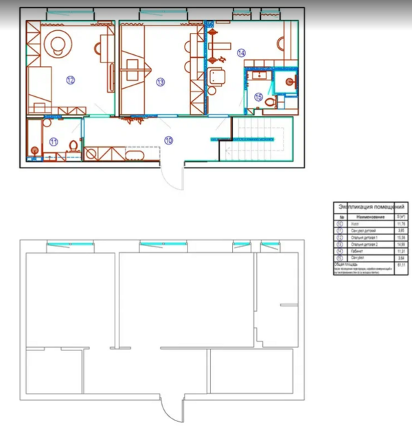 На первом этаже мы изменили конфигурацию перегородок, чтобы создать изолированный мастер-блок. Теперь вход в спальню идет через вместительную гардеробную, что избавляет жилую комнату от лишних шкафов. Выделили рабочий кабинет, который отделили стеклянной раздвижной перегородкой. Второй этаж претерпел более серьезные изменения: мы убрали лишние стены между спальней и коридором. Благодаря этому удалось выкроить место под отдельный кабинет для главы семьи с собственным входом в санузел. Две соседние комнаты отвели под детские, наполнив их системами хранения.