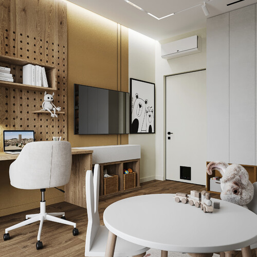 Комната выполнена в светлой гамме с теплыми горчичными акцентами, которые создают солнечное настроение. Центральное место занимает функциональная рабочая зона с деревянной перфорированной панелью для удобного хранения мелочей и творчества.