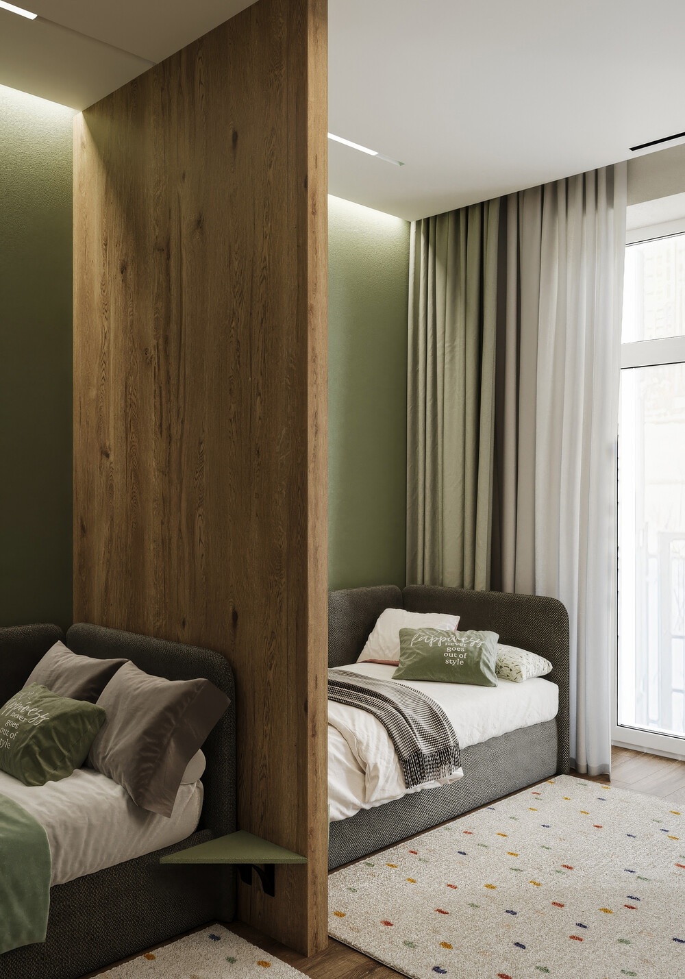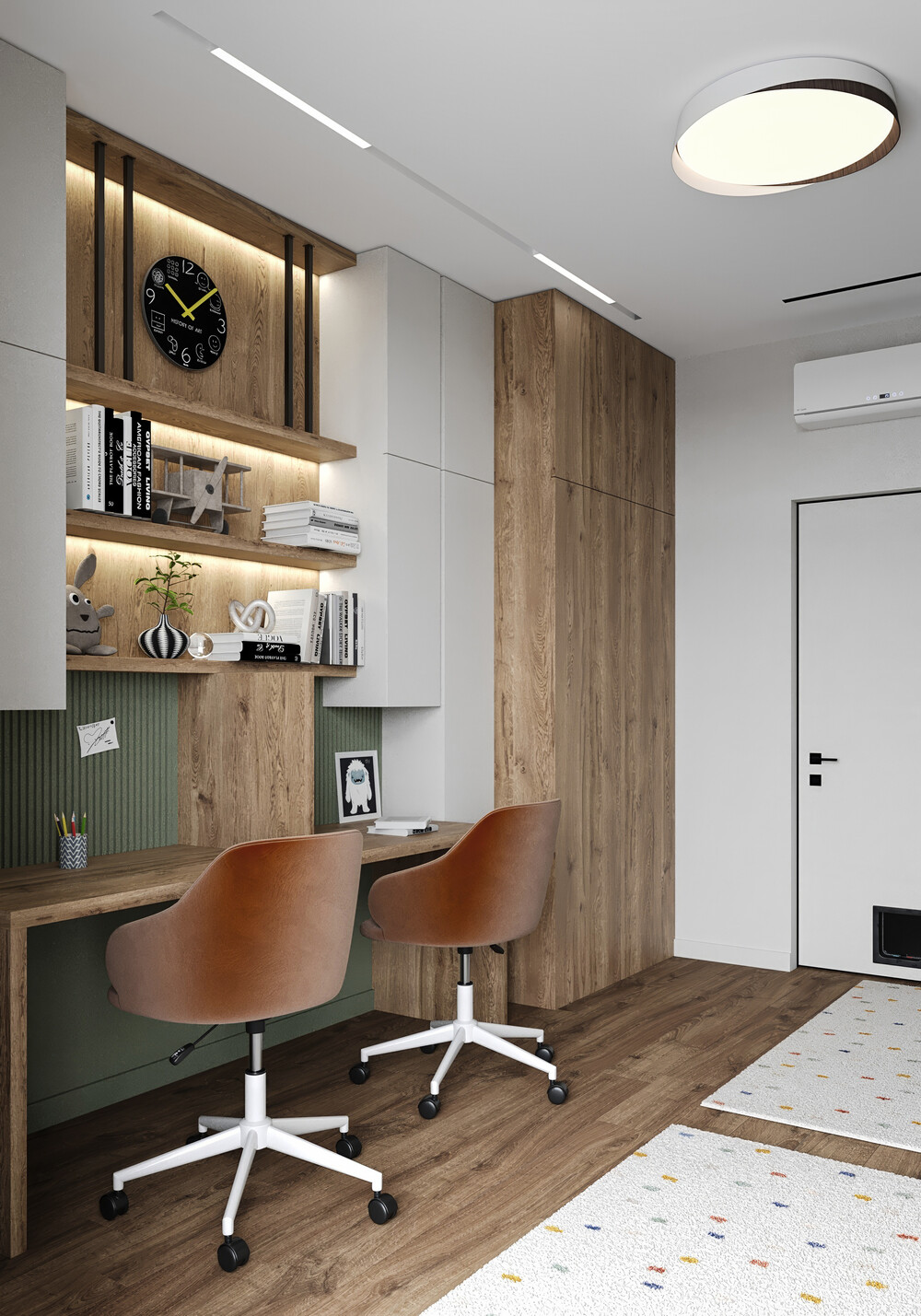 Для оформления детской мы выбрали спокойную базу в оливковых и древесных тонах, которая не надоест ребенку через пару лет. Основную стену занимает длинная столешница на два рабочих места, дополненная открытыми полками с мягкой подсветкой для книг и декора.