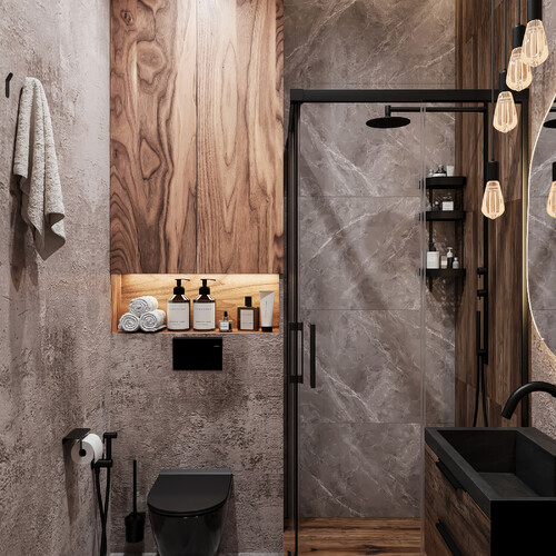 В основном санузле мы применили серо-графитовую гамму, разбавив её панелями под дерево для визуального тепла. Зеркало необычной формы со встроенной подсветкой работает на расширение границ узкого помещения. Душевую зону отгородили прозрачным стеклом и добавили встроенные полки-ниши для хранения косметики. Все коммуникации скрыли, оставив на виду только лаконичную сантехнику.