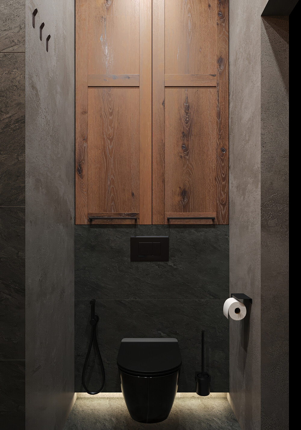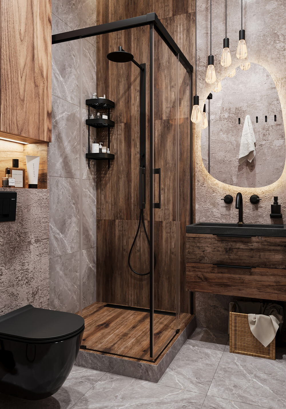 Для гостевого санузла выбрали керамогранит с текстурой камня и контрастную черную сантехнику. Несмотря на компактный размер, здесь удалось разместить полноценную душевую для гостей и второго этажа. Деревянные вставки и скрытая подсветка у зеркала добавляют глубины и избавляют интерьер от монотонности. Каждое решение здесь продиктовано эргономикой и легкостью в уборке.