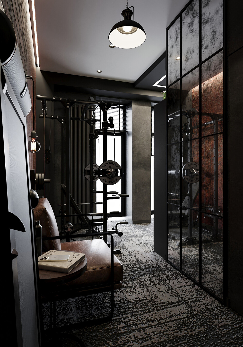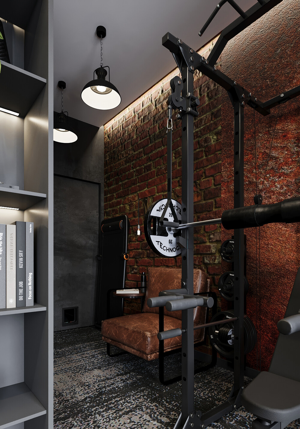 Вторую часть комнаты занял профессиональный силовой тренажер на фоне кирпичной стены с направленным светом. Для смены деятельности и отдыха предусмотрели кожаное кресло, где можно восстановиться после тренировки или звонка.