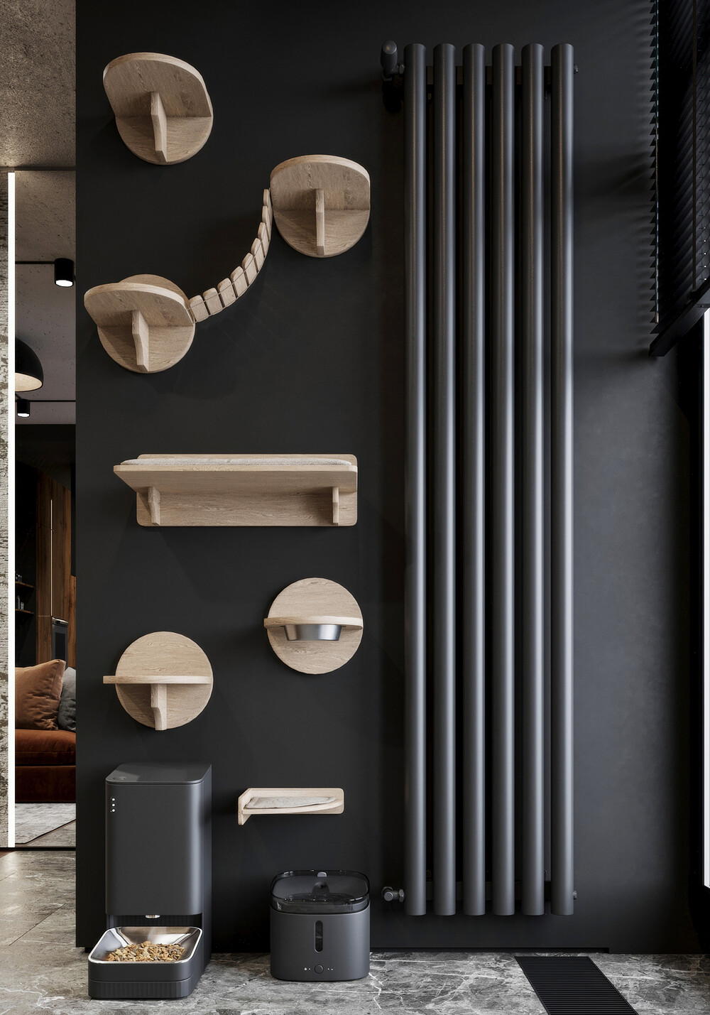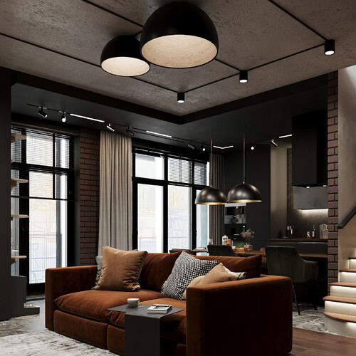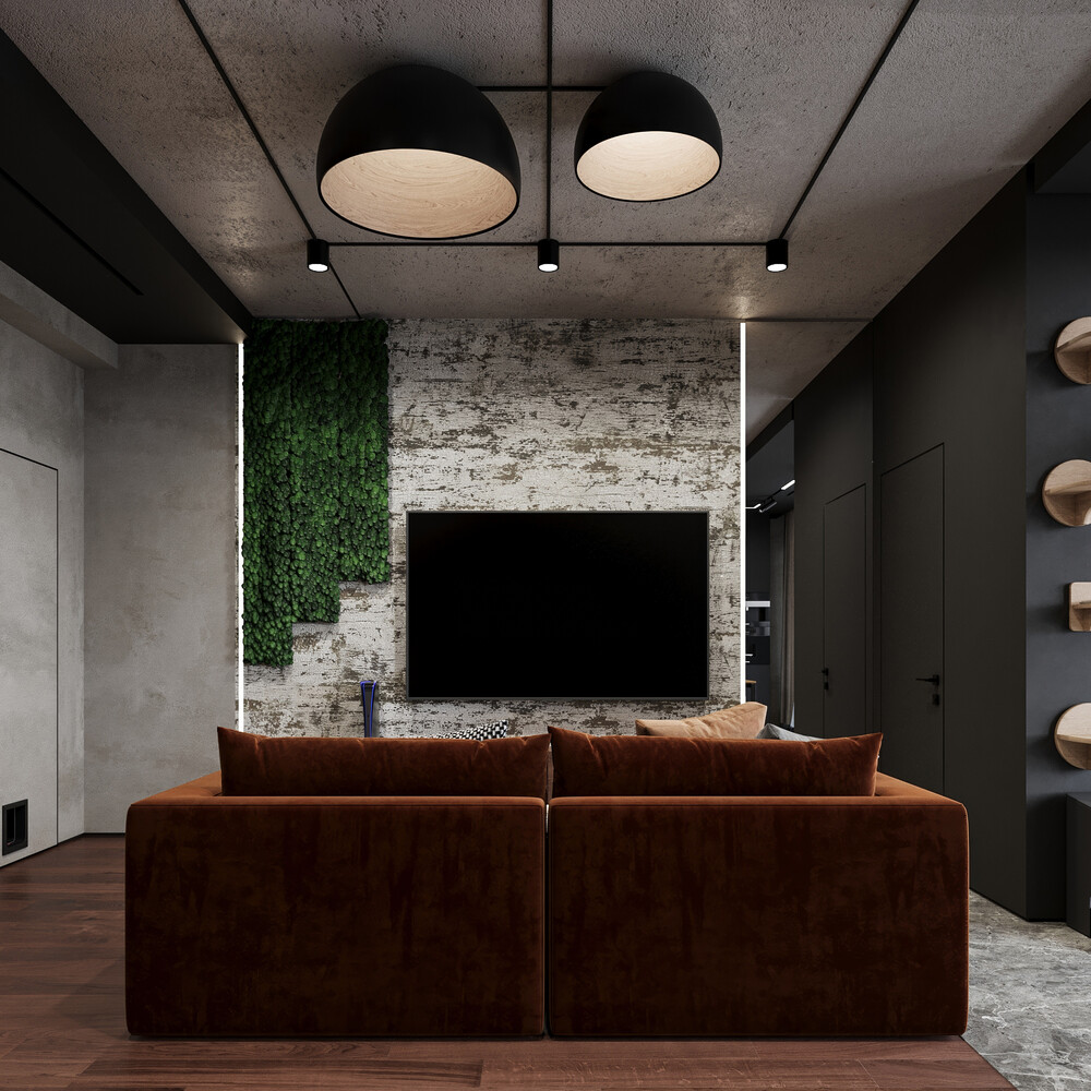 Интерьер базируется на сочетании брутального лофта и современного минимализма. Основная палитра — глубокие серые и темные тона, которые создают камерную обстановку. Чтобы пространство не выглядело холодным, мы внедрили фактуры натурального дерева и вкрапления живой зелени (мох, растения).