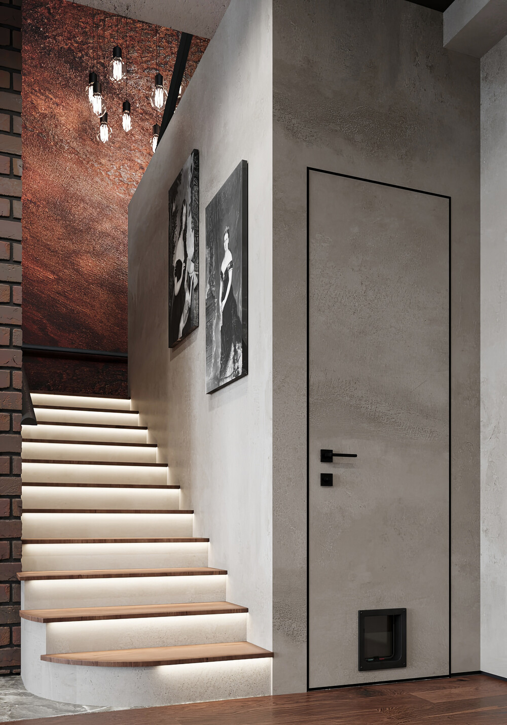 Прихожую облицевали темными панелями и кирпичом, сразу задавая индустриальный тон при входе в квартиру. Лестницу на второй этаж выделили каскадными лампами, превратив её из простого конструктива в визуальный центр.