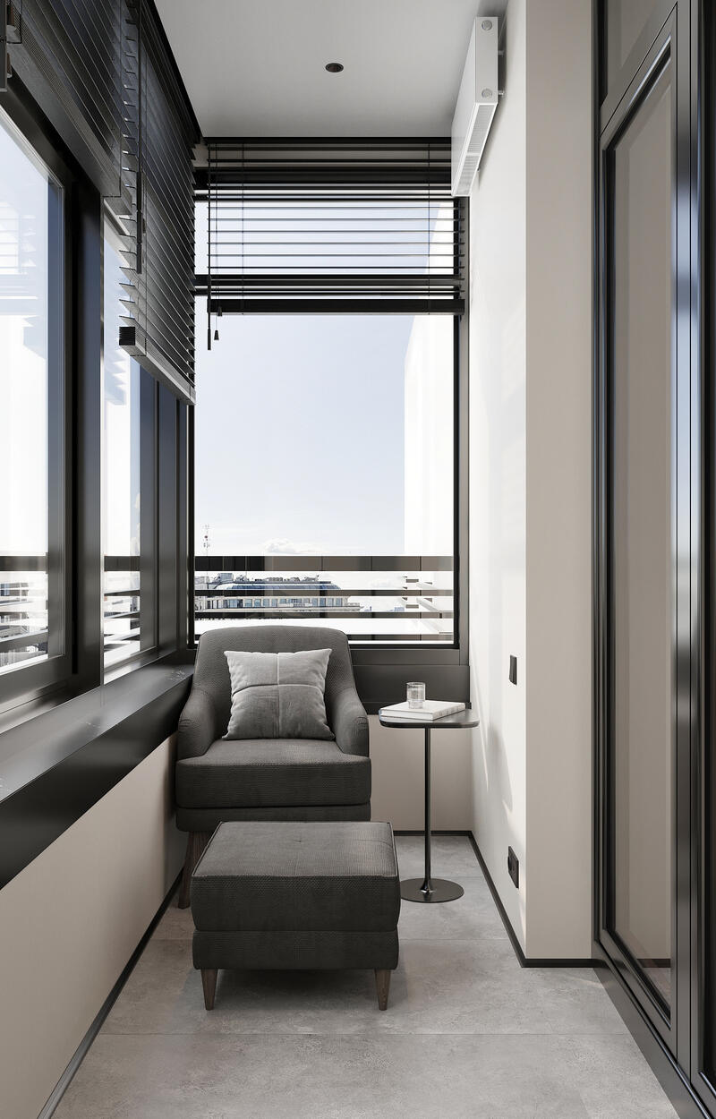 Балкон организован как компактная зона отдыха с мягким креслом и пуфом. Светлые стены и панорамное остекление дают много дневного света. Рядом установлен небольшой столик для чтения или кофе. С противоположной стороны — высокий шкаф для сезонного хранения. На полу — керамогранит, удобный в эксплуатации.