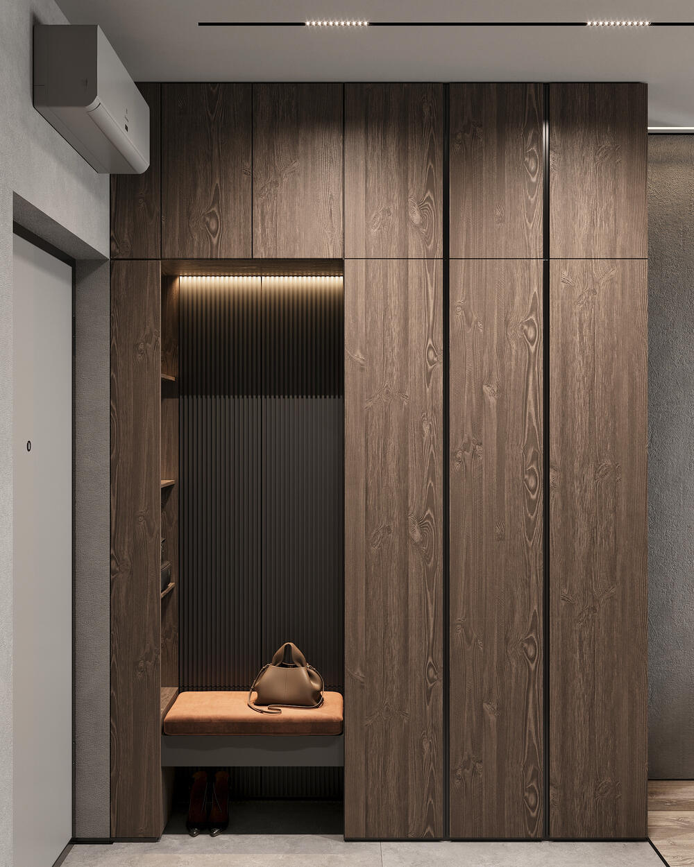Прихожая интегрирована в общую зону и выстроена максимально функционально. Установлен высокий шкаф из тёплого древесного декора для верхней одежды и повседневных вещей. В нише предусмотрено место для сидения. Напротив — консоль с подсветкой и крупным зеркалом, которое визуально расширяет входную часть. Стены оформлены под бетон, поддерживая минимализм с лофт-элементами.