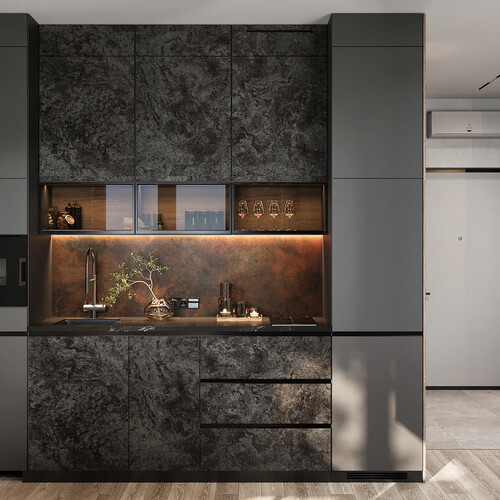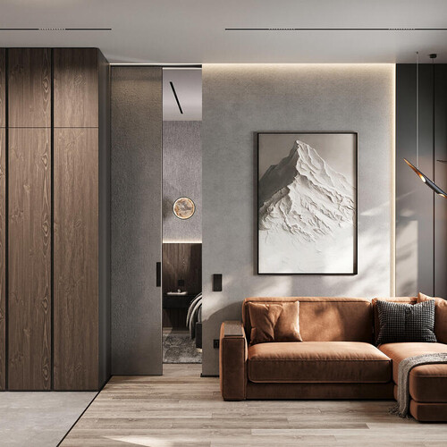 Интерьер выполнен в современном минимализме с элементами лофта. Цветовая база построена на тёмных, серых и бежевых оттенках. Контраст фактур добавляет глубину, а точечные световые акценты делают пространство выразительнее.