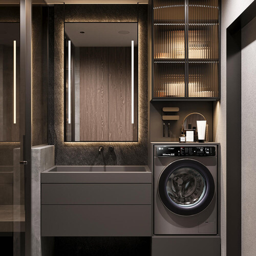 Санузел оформлен в тёмных бетонных оттенках, поддерживающих общий стиль квартиры. Душевая зона — формата walk-in со встроенной длинной скамьёй и верхним душем. В стене предусмотрены ниши с подсветкой для хранения. Раковина встроена в монолитную тумбу с гладким фасадом. Стиральная машина размещена в общем блоке с закрытыми полками. Пространство выглядит строго и цельно, с акцентом на практичность и чистую геометрию.