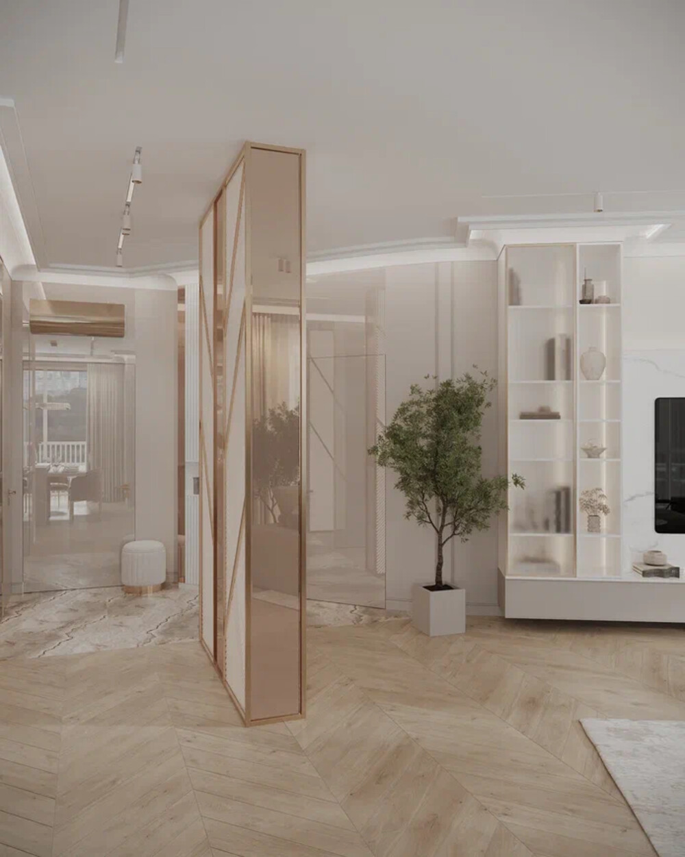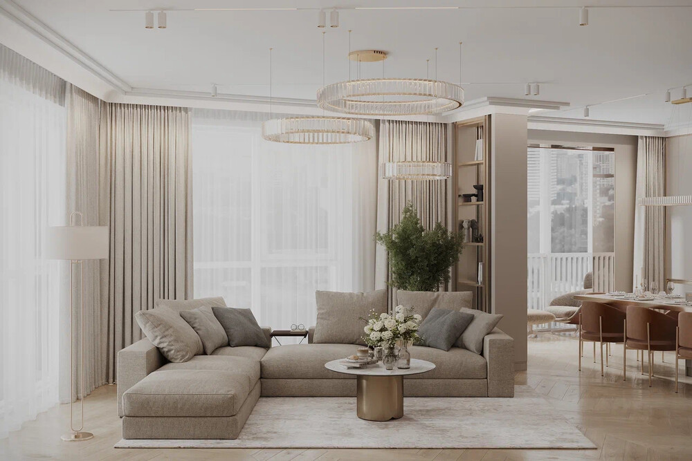 Проект сочетает в себе черты современной классики и декоративность ар-деко. За основу взяли карамельные, песочные и бежевые тона с вкраплениями серого цвета. Такая палитра делает комнаты глубже и визуально «смягчает» строгую геометрию мебели.
