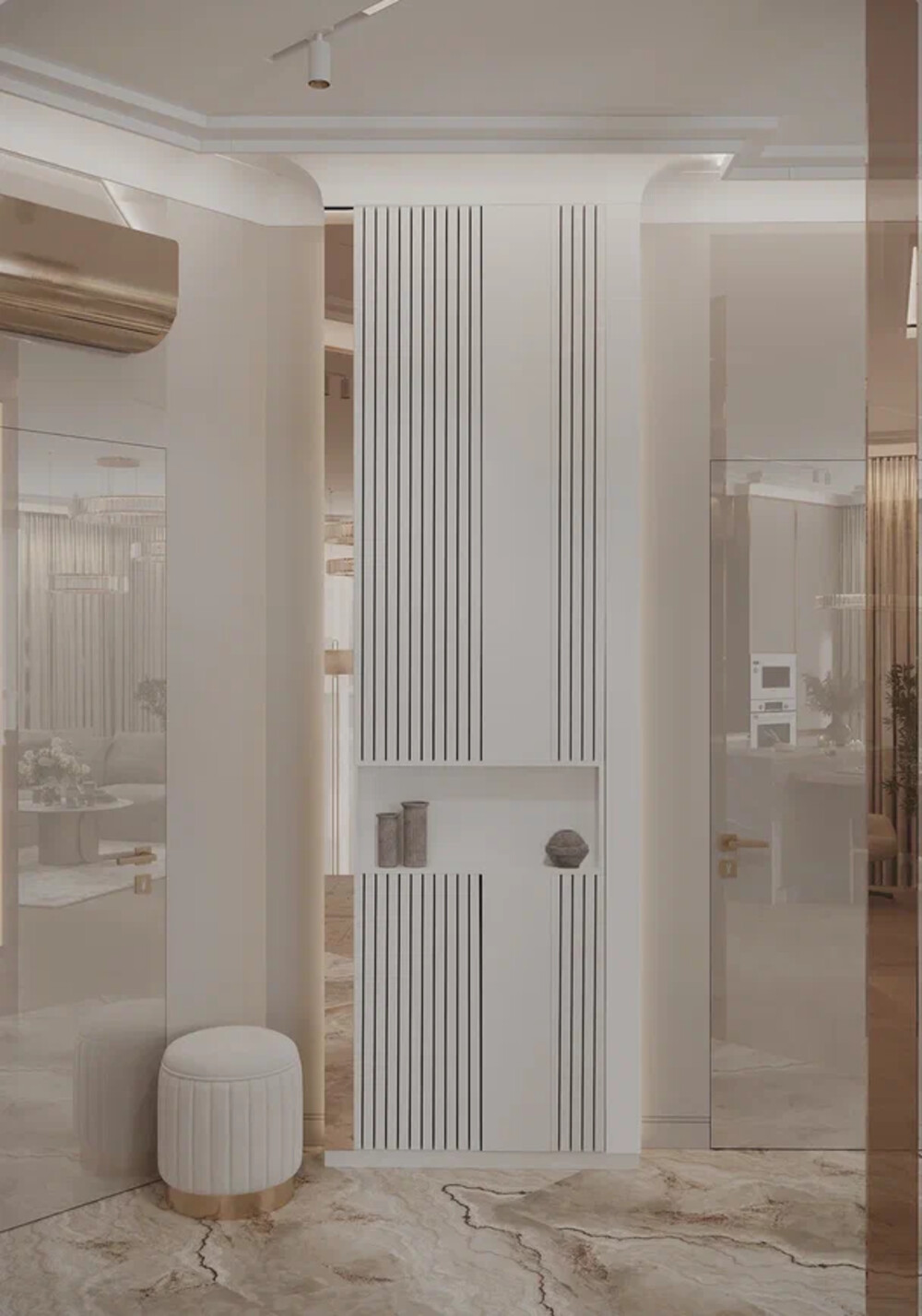 В прихожей использовали много зеркальных и стеклянных поверхностей, чтобы визуально увеличить входную группу. Напольное покрытие из камня с радиусной стыковкой плавно переходит в отделку кухни-гостиной.