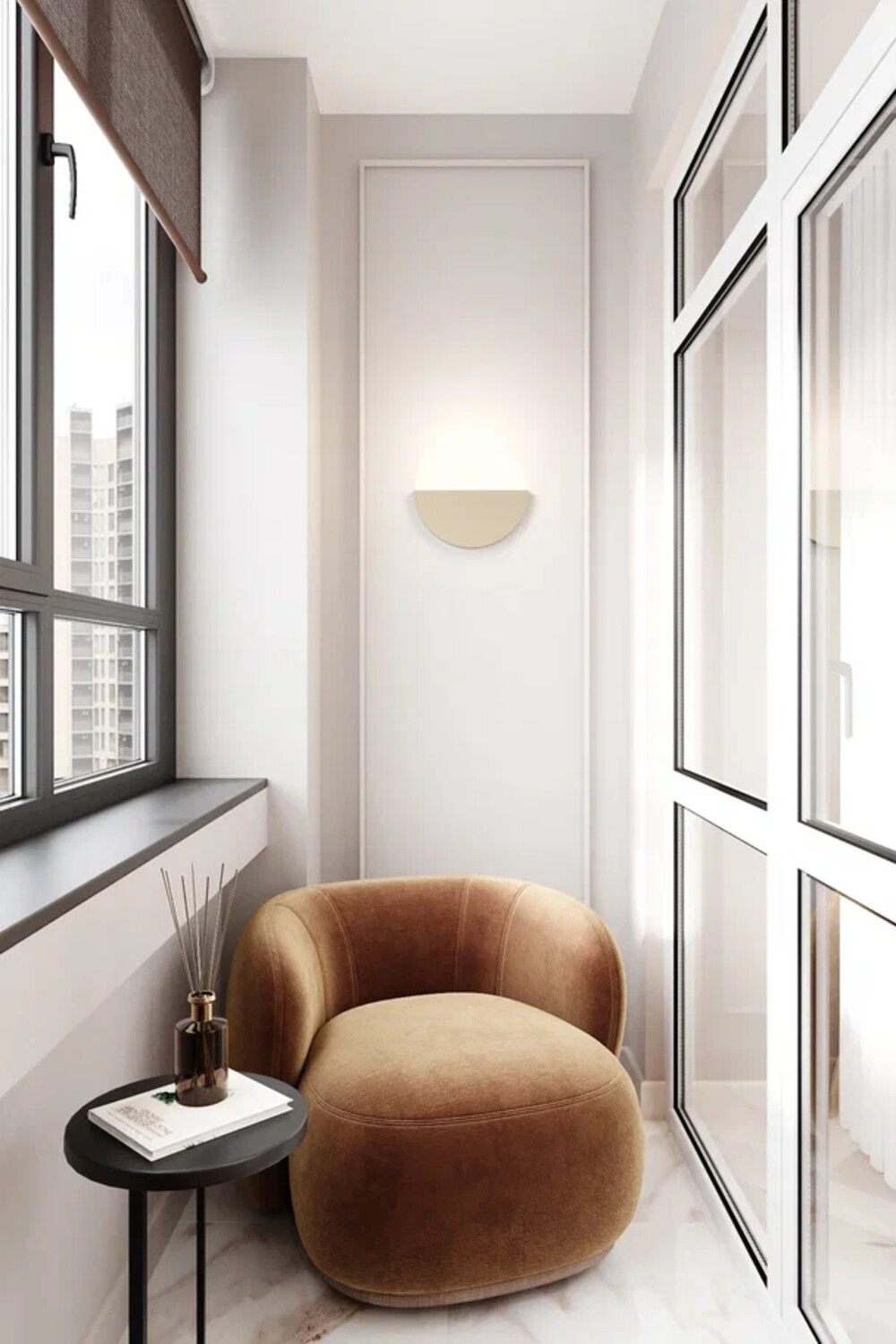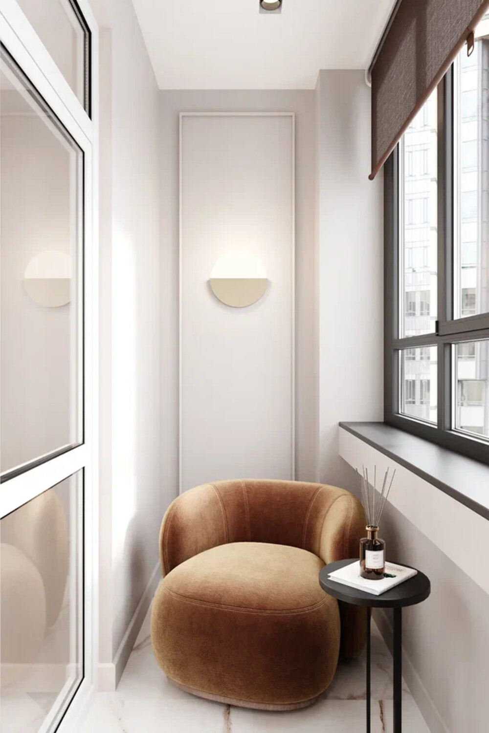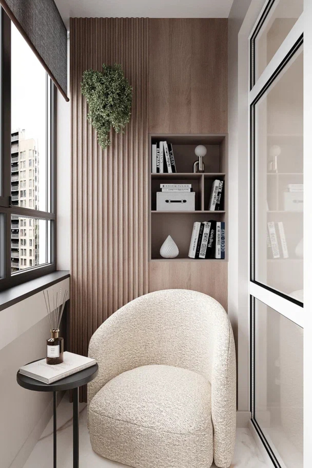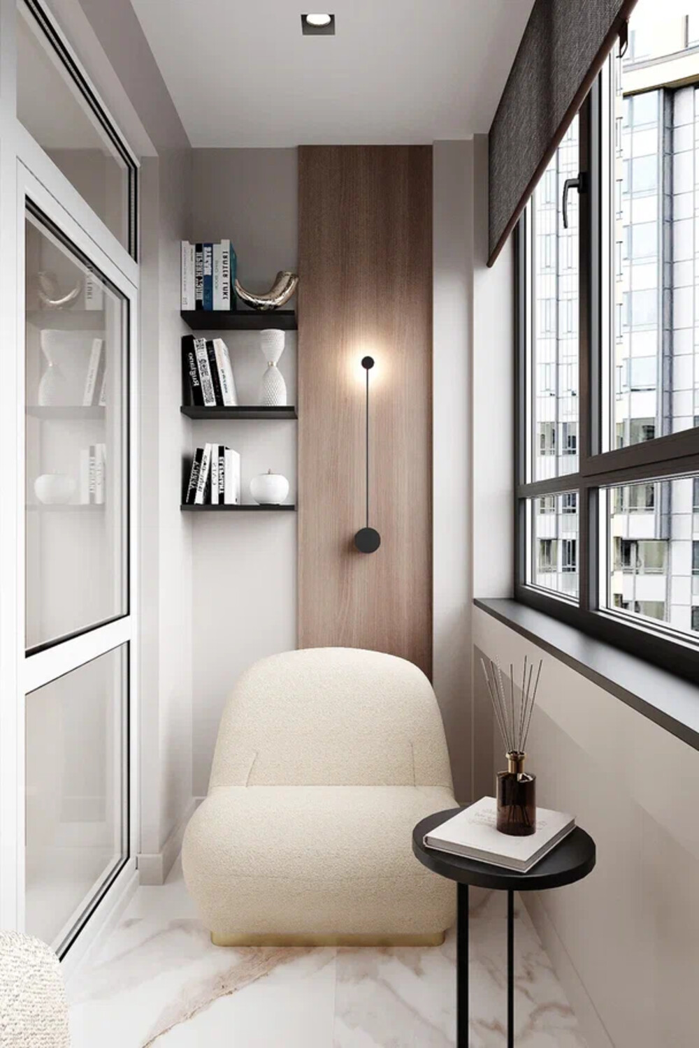 Балкон из гостиной оформили как компактную зону отдыха. Здесь разместили мягкое кресло, открытые полки и акцентную рейку, объединённые в одну композицию. Добавили настенный светильник и небольшой столик — пространство подходит для чтения и короткого отдыха.