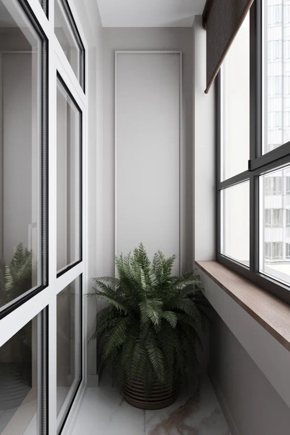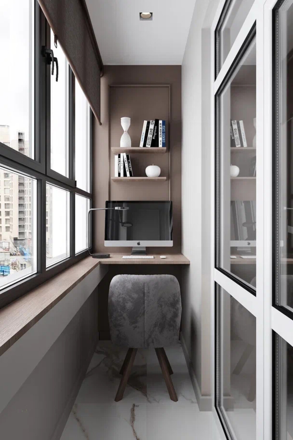 Балкон при спальне задействовали как рабочее место. Установили столешницу и встроенные полки. Отделка и мебель выполнены в нейтральной гамме, чтобы зона не выбивалась из общего стиля и не перегружала пространство.
