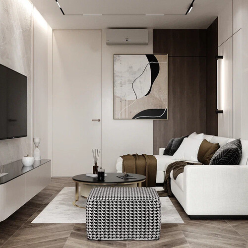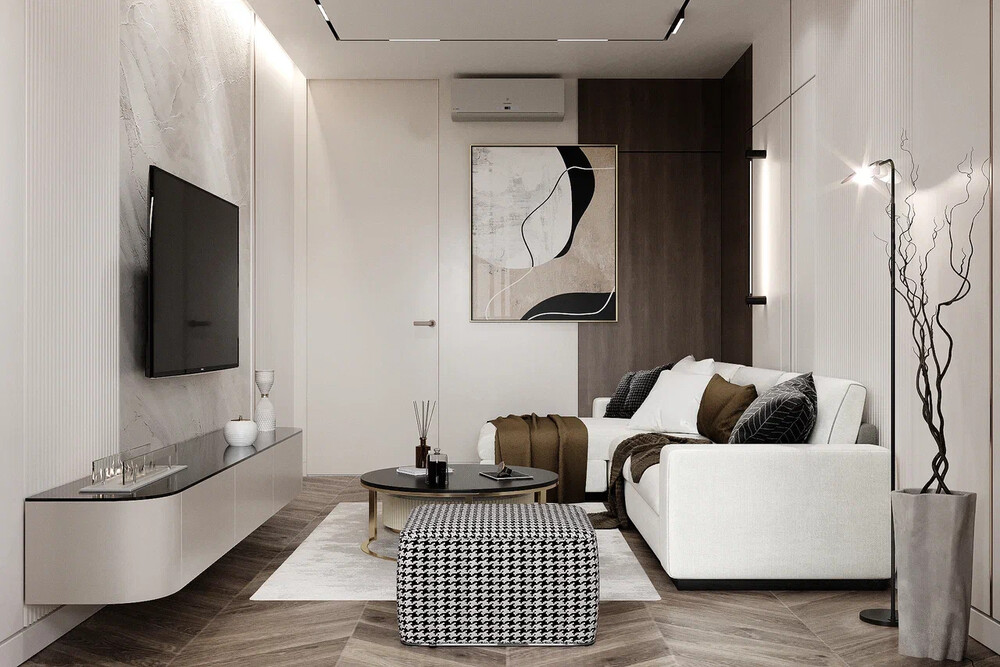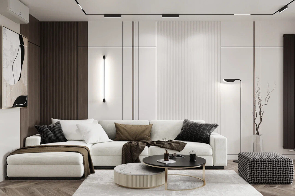 Гостиная в пастельной серо-бежевой гамме с тёмными контрастами. В отделке стен использована комбинация материалов: панели под дерево, вертикальные рейки и декоративные плоскости с графикой.