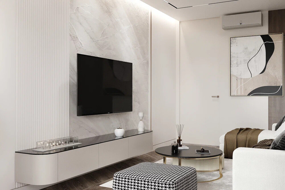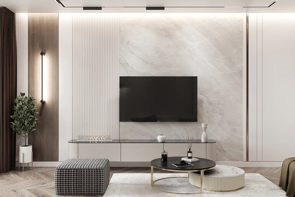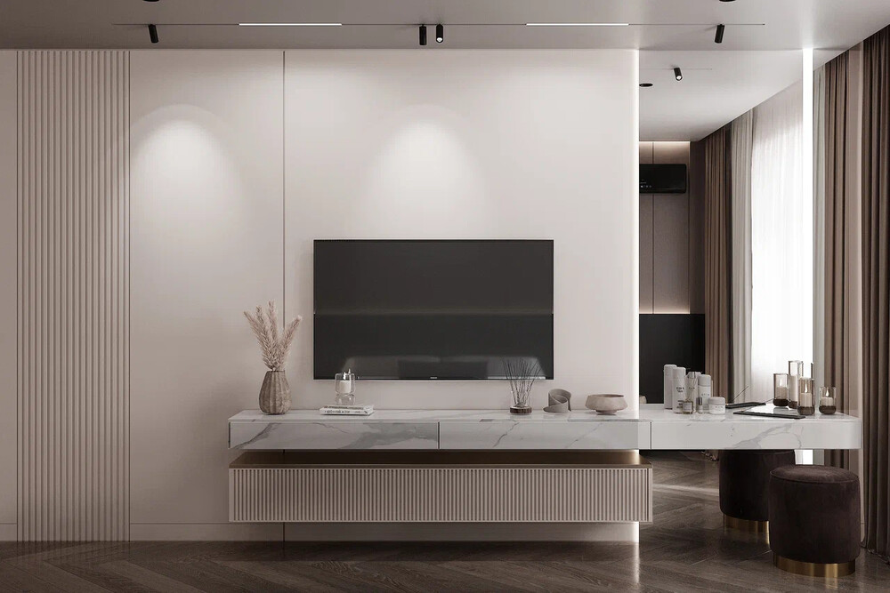 Центром композиции стала ТВ-зона с крупной панелью под камень и подвесной тумбой с тёмной столешницей. Угловой диван формирует основную зону отдыха, текстиль подобран в глубоких оттенках коричневой палитры.