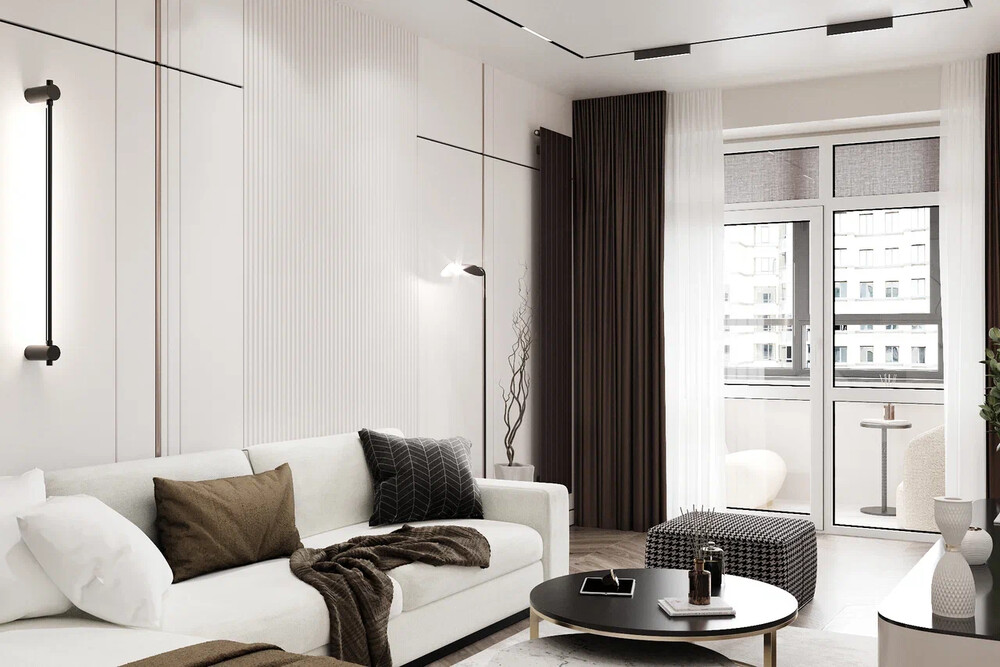 Светлая корпусная мебель и журнальные столики с контрастными поверхностями добавляют баланса. Панорамное остекление усиливает естественное освещение гостиной.