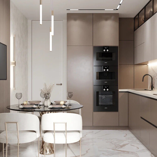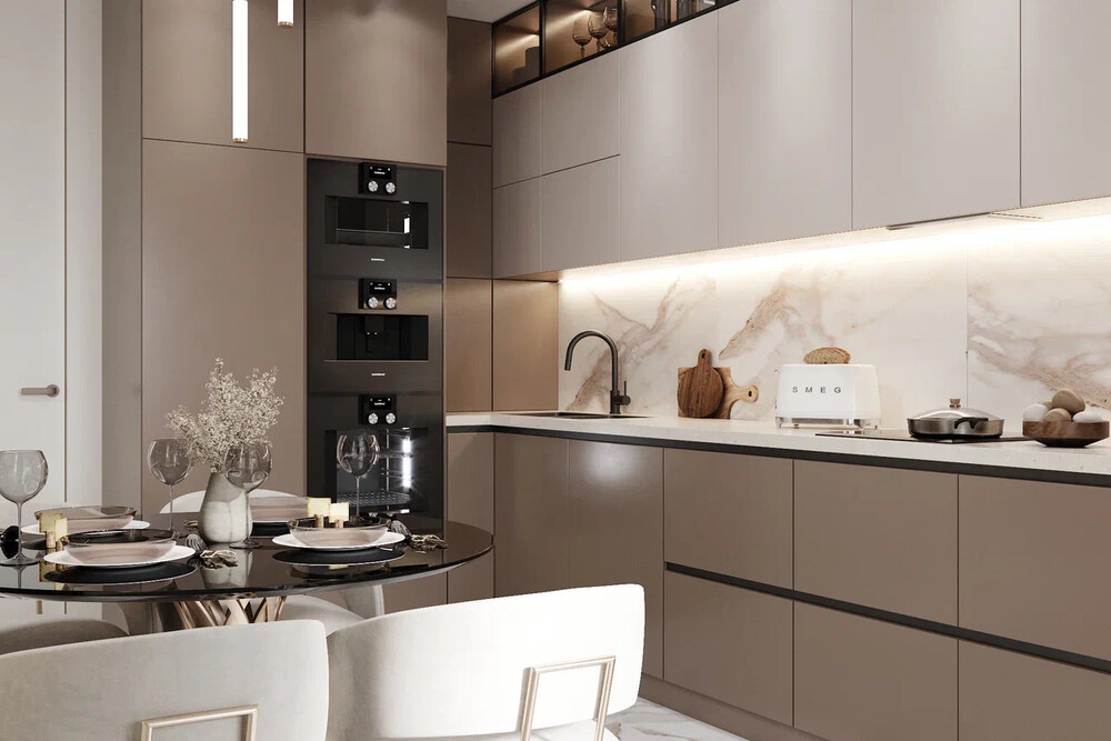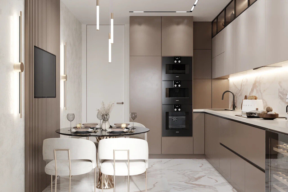 Фартук оформлен керамогранитом с выразительными прожилками. Варочная панель, духовой шкаф, кофемашина и винный шкаф собраны в единый вертикальный блок — так техника выглядит аккуратно и логично. Обеденную группу разместили у стены с декоративными рейками и мягкой подсветкой.
