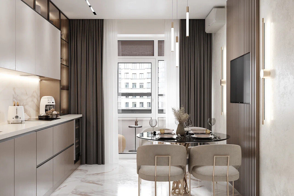 На кухонном балконе организовали мини-лаунж-зону. Поставили мягкое кресло округлой формы и компактный приставной столик. Стену оформили лаконичной панелью со встроенным светильником. Оттенок обивки перекликается с основной палитрой кухни.