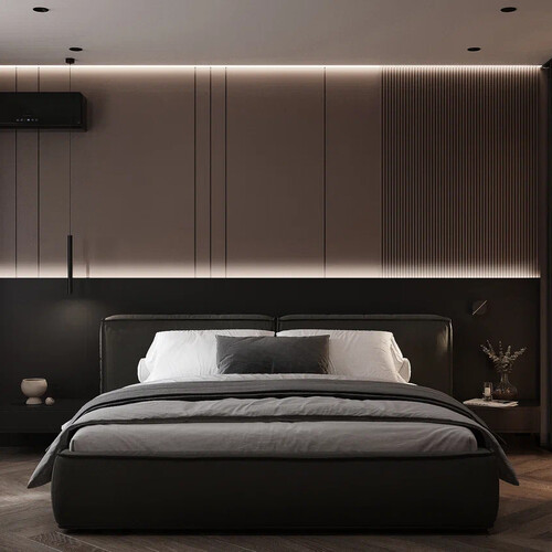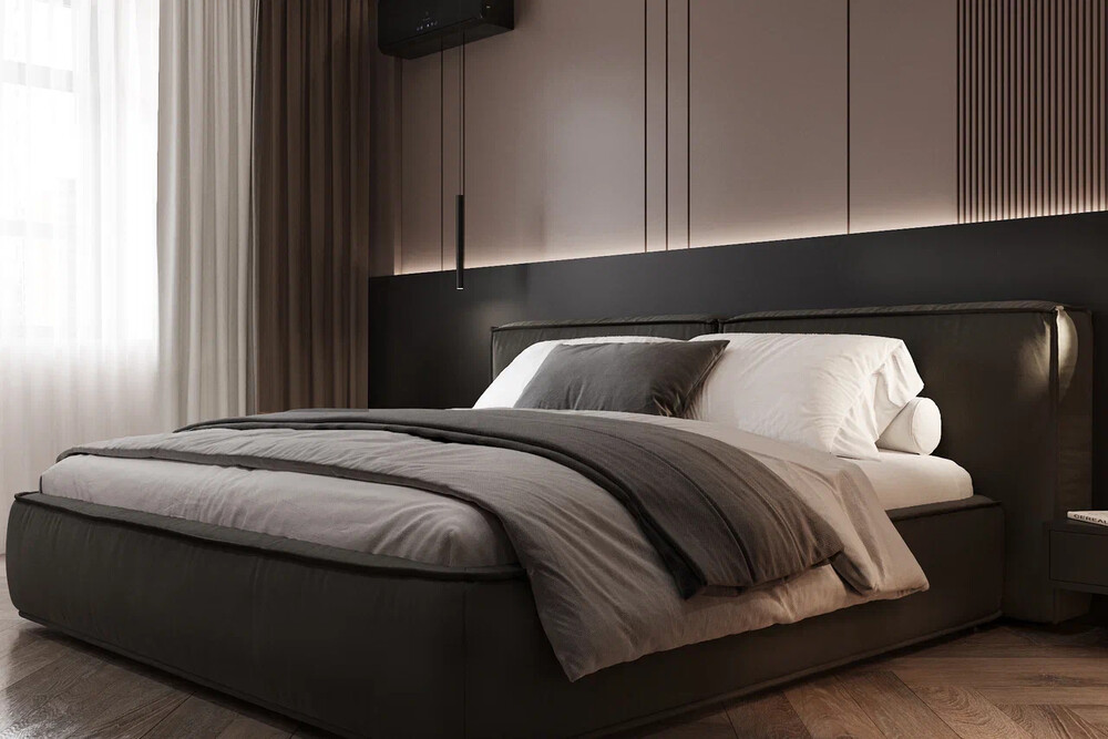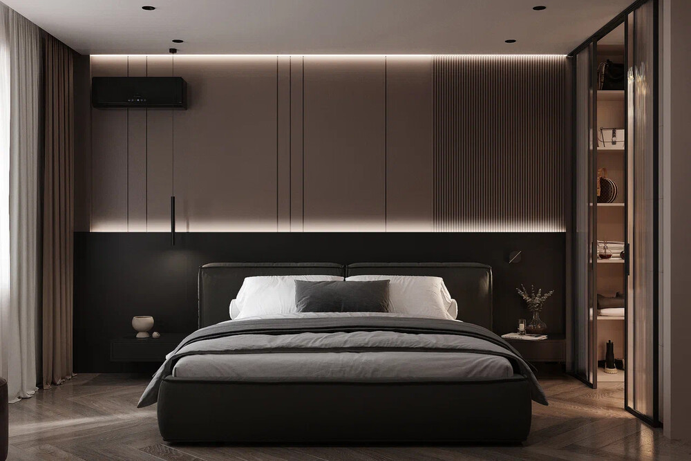 Спальня построена на контрасте светлых поверхностей и тёмной мебели. Центральный элемент — кровать с мягким изголовьем и встроенной подсветкой. Стены оформлены сочетанием гладких панелей и вертикальных реек.