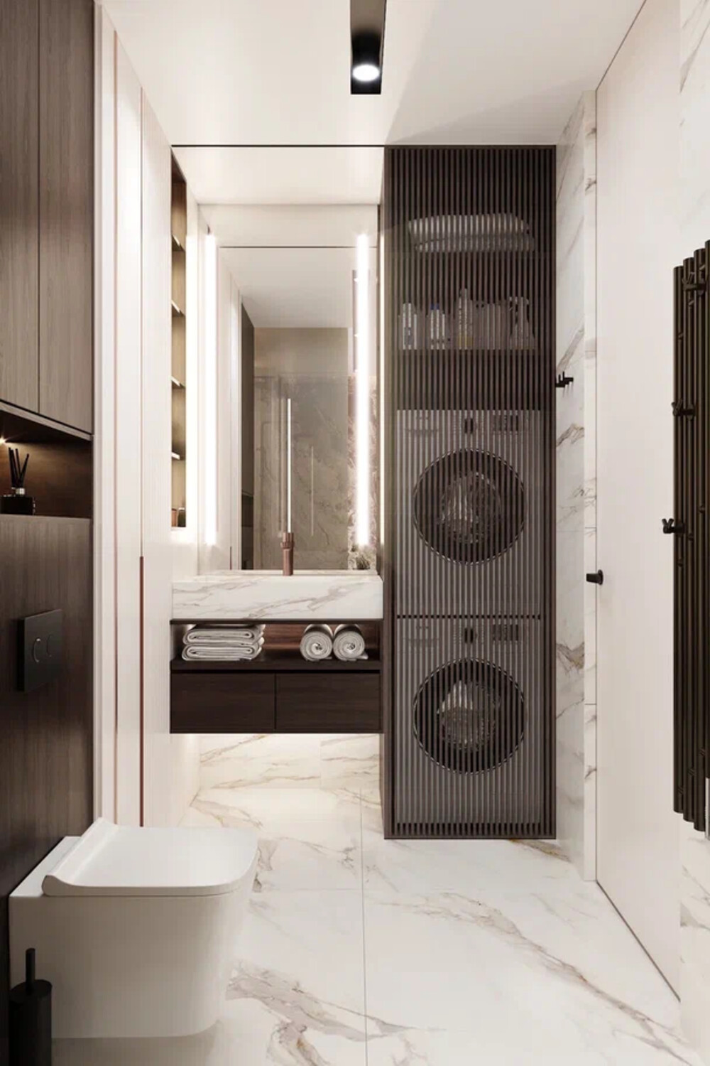 Шкафы выполнены в серо-бежевой гамме, фурнитура — тёмная. На полу использован крупноформатный керамогранит с активной текстурой. Подсветка зеркала и вертикальные линии света добавляют глубины.