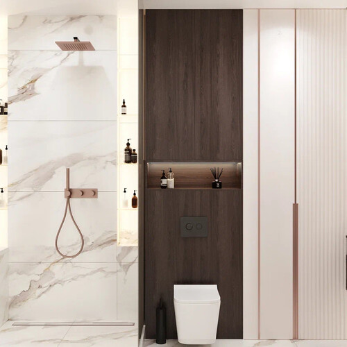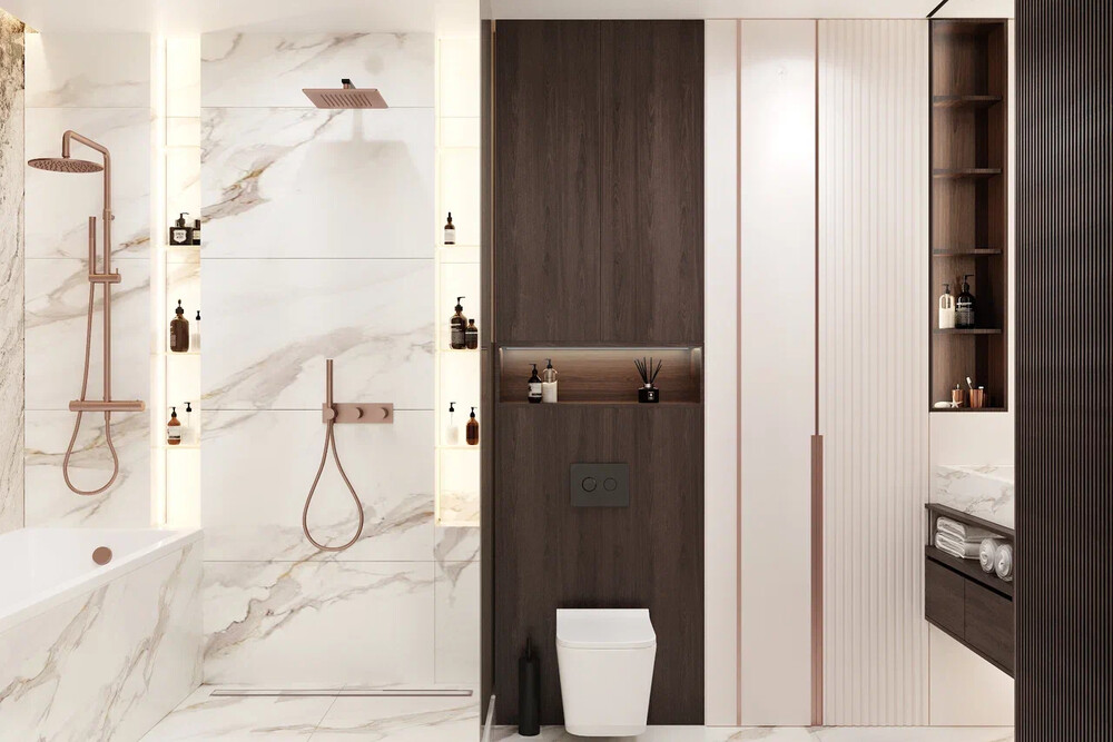 Санузел объединили и оформили как единое пространство с ванной и душевой. Основной материал — керамогранит с выразительными прожилками, использованный на стенах и полу.