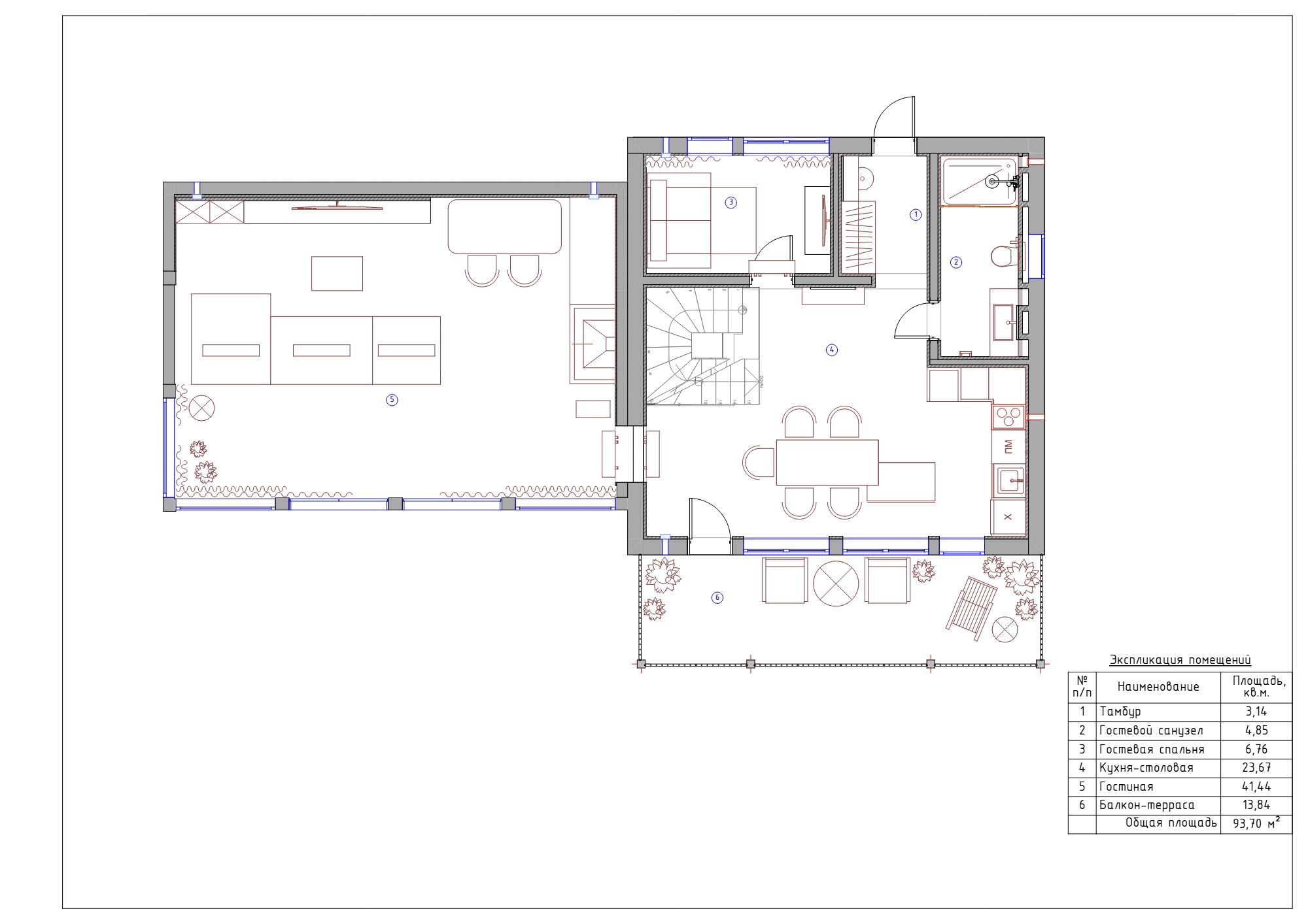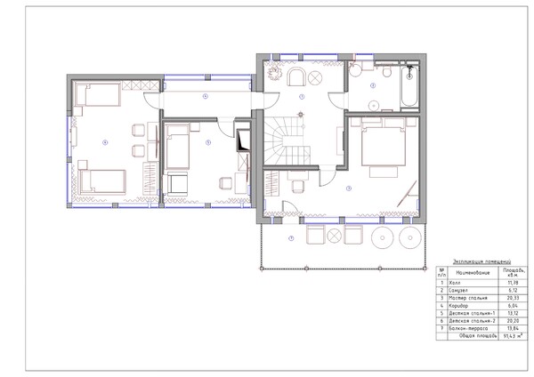 Мы сохранили исходную структуру дома, разделив его на старую часть из бруса и новую каркасную пристройку. В цокольном этаже обустроили активную зону с мастерской, игровой и прачечной. Первый уровень отвели под общую гостиную, кухню-столовую и гостевую спальню с террасой. На втором этаже разместили приватный блок с мастер-спальней и двумя детскими комнатами.