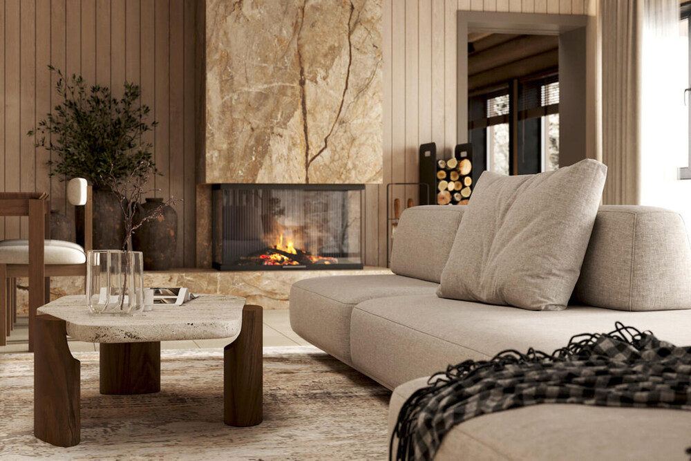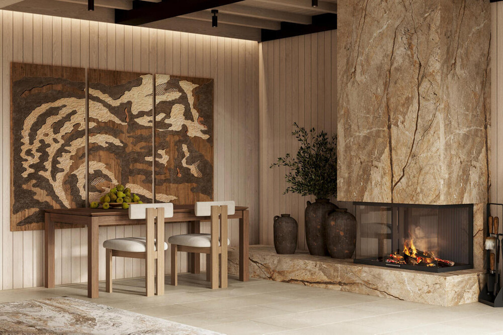 Крупноформатный керамогранит — применен в отделке острова, камина и мокрых зон для защиты поверхностей.