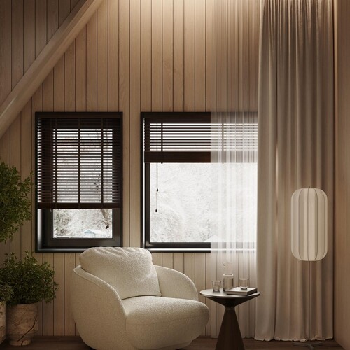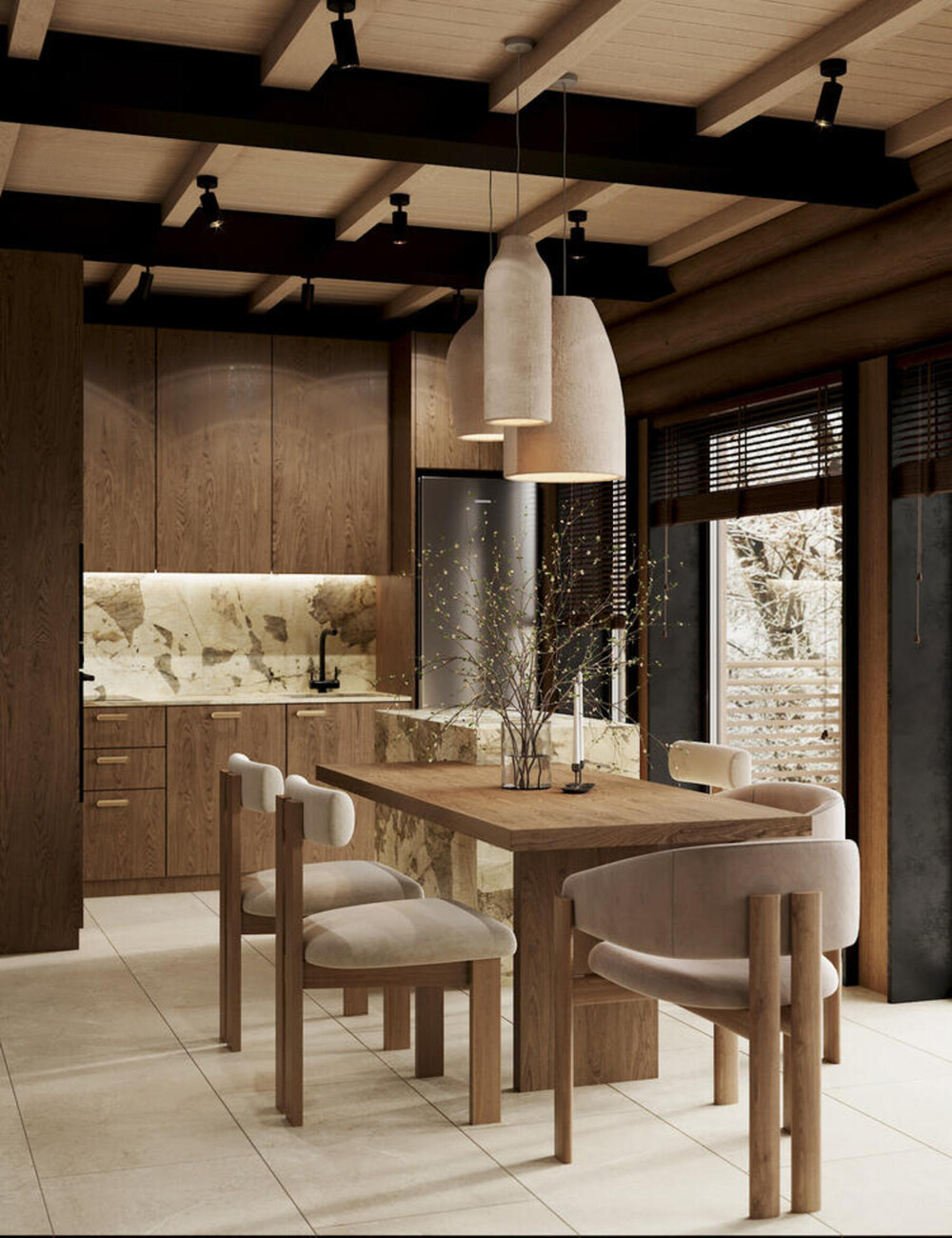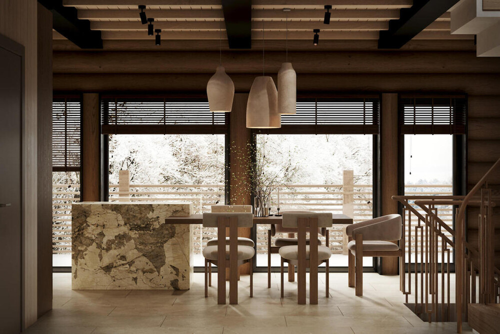 Фасады кухни выполнили в тон деревянных стен, чтобы растворить рабочую зону в интерьере. Технику расположили в шаговой доступности, оставив свободные проходы для большой семьи. Панорамные окна закрыли горизонтальными жалюзи, которые мягко дозируют естественный свет.