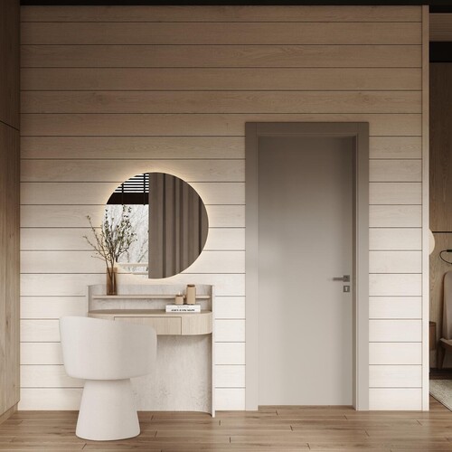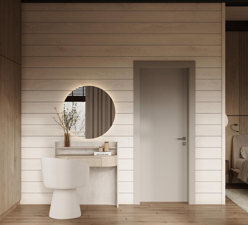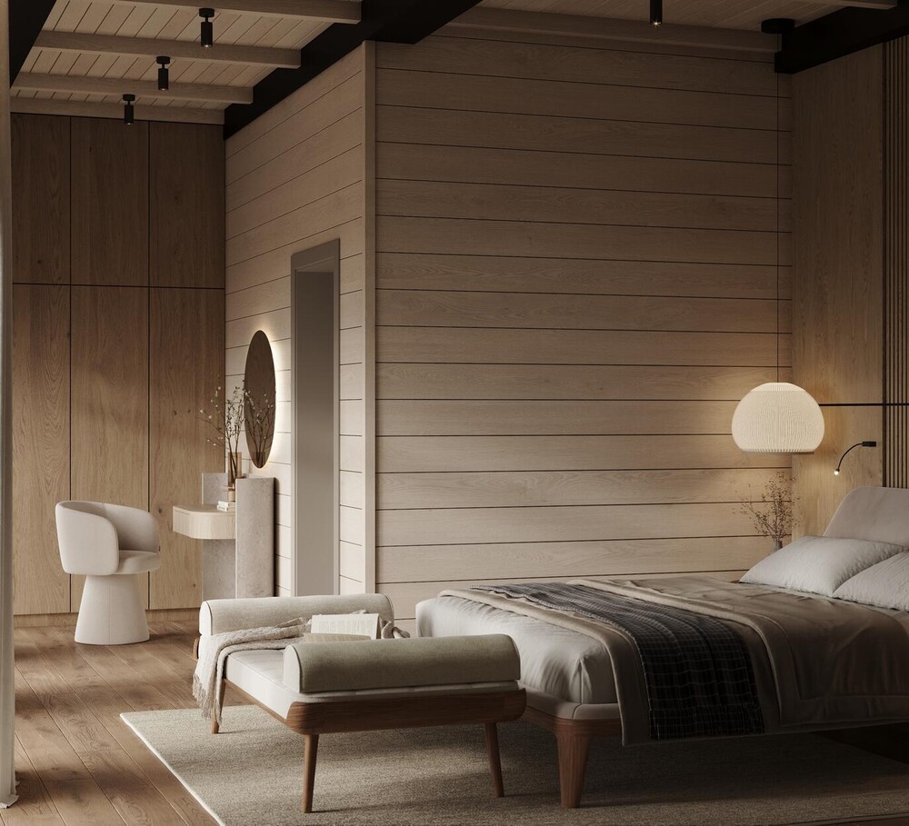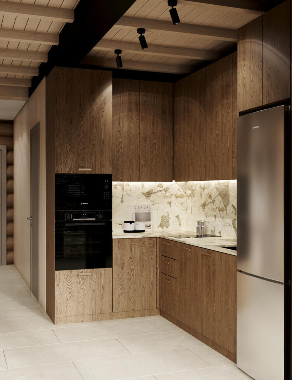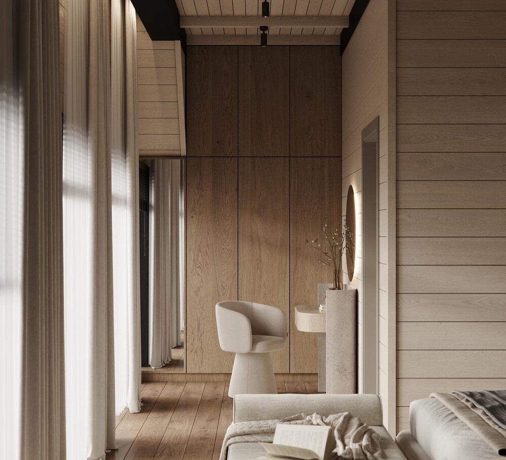 Клееный брус и шпон — формируют основу интерьера, сохраняя экологичность и природную фактуру стен.