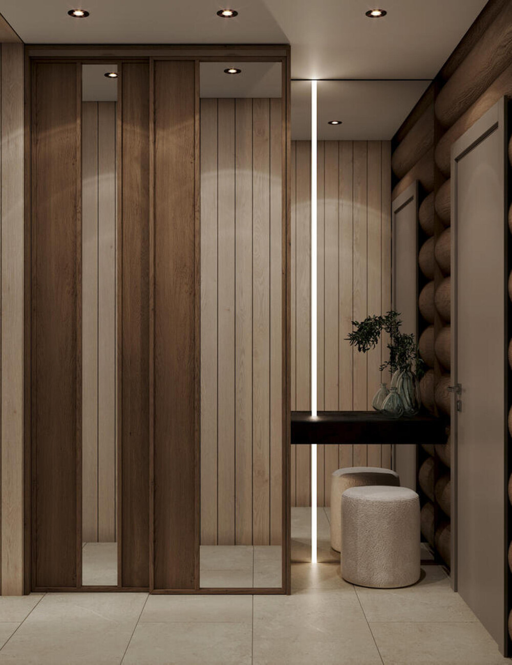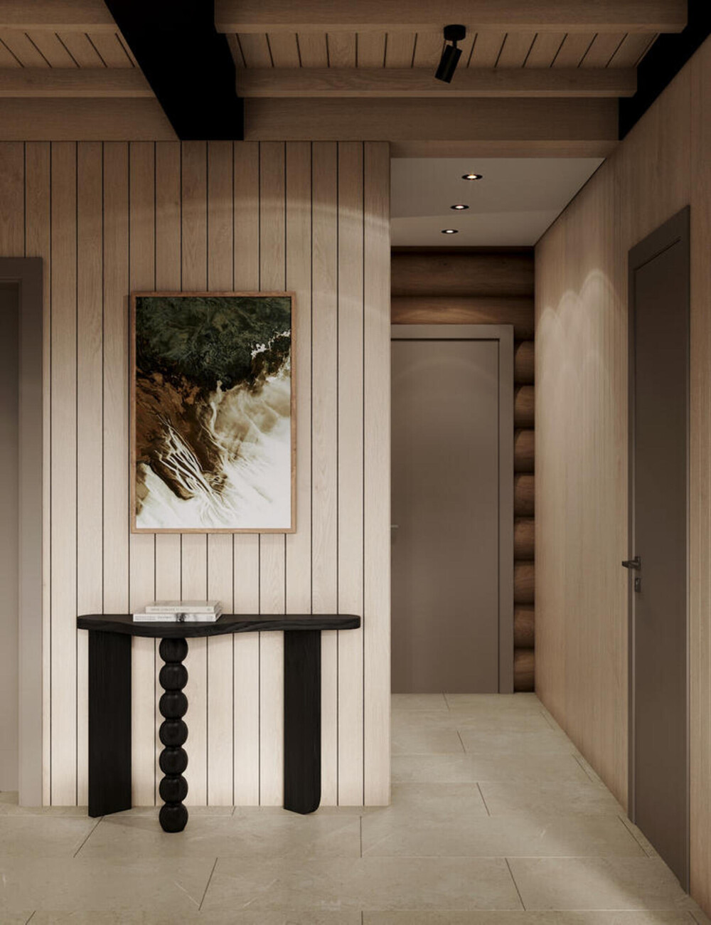 Входную зону оформили в теплых тонах с использованием керамогранита под светлый камень на полу. Стены объединяют фактуру оцилиндрованного бруса и лаконичные вертикальные панели с текстурой дерева.
