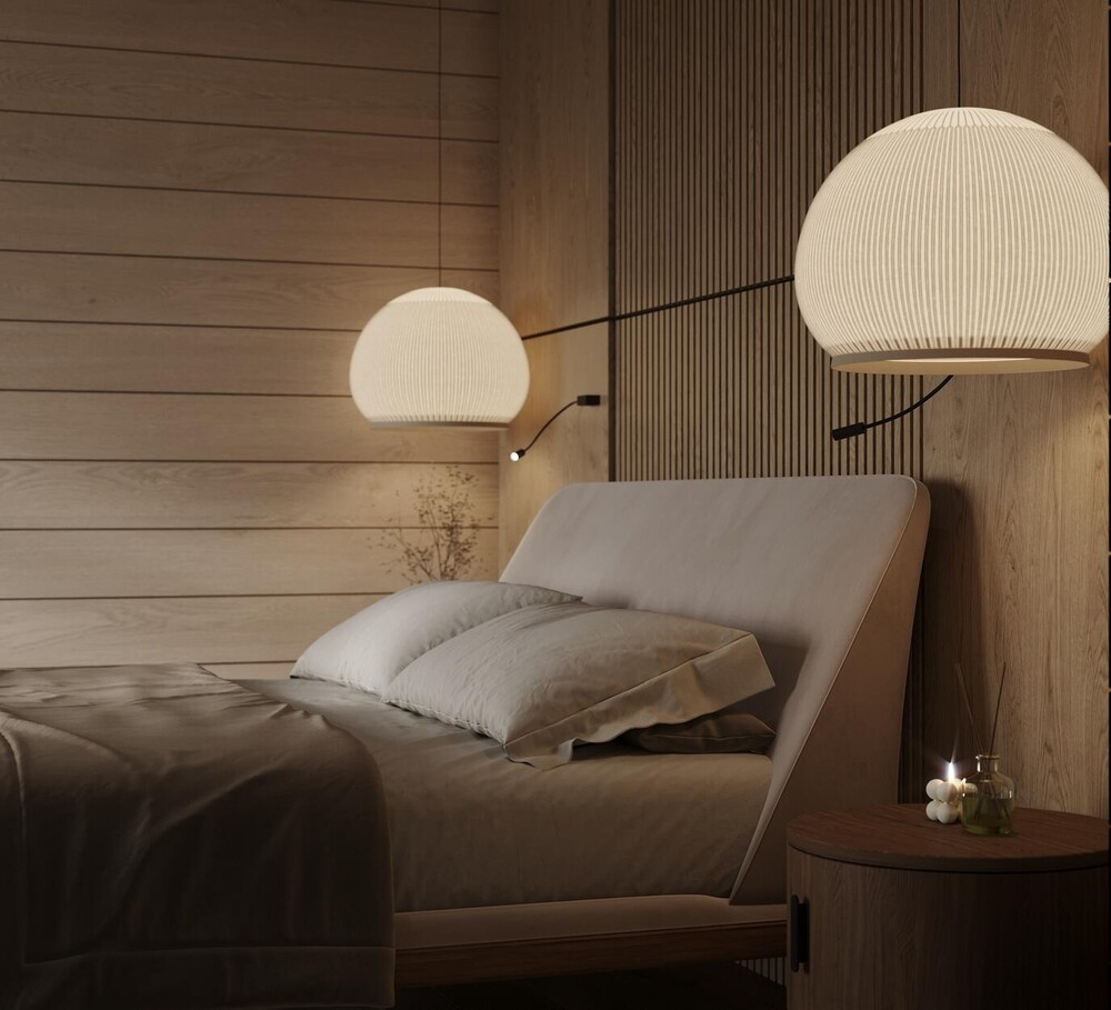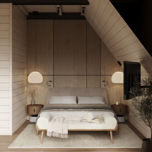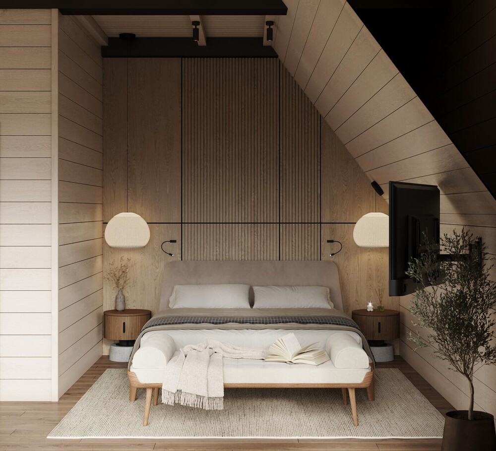 Стены спальни сохранили фактуру натурального дерева, которую подчеркнули направленным светом и лаконичной мебелью. Кровать дополнили мягким изголовьем и тумбами в минималистичном стиле без лишнего декора.