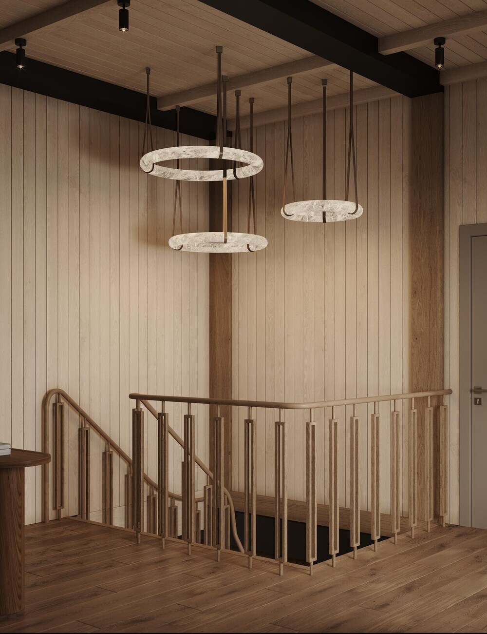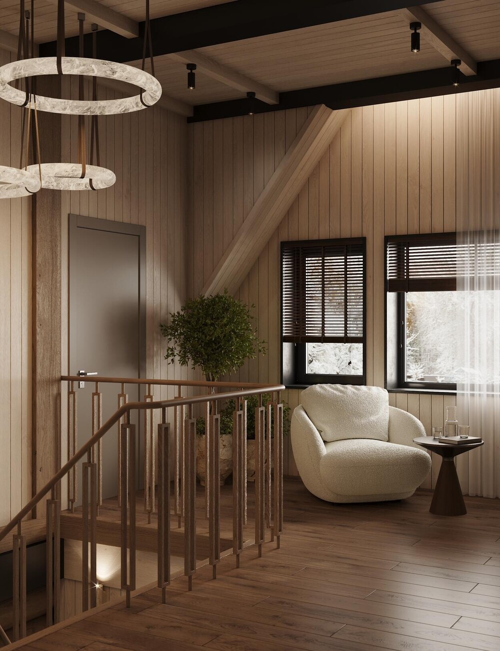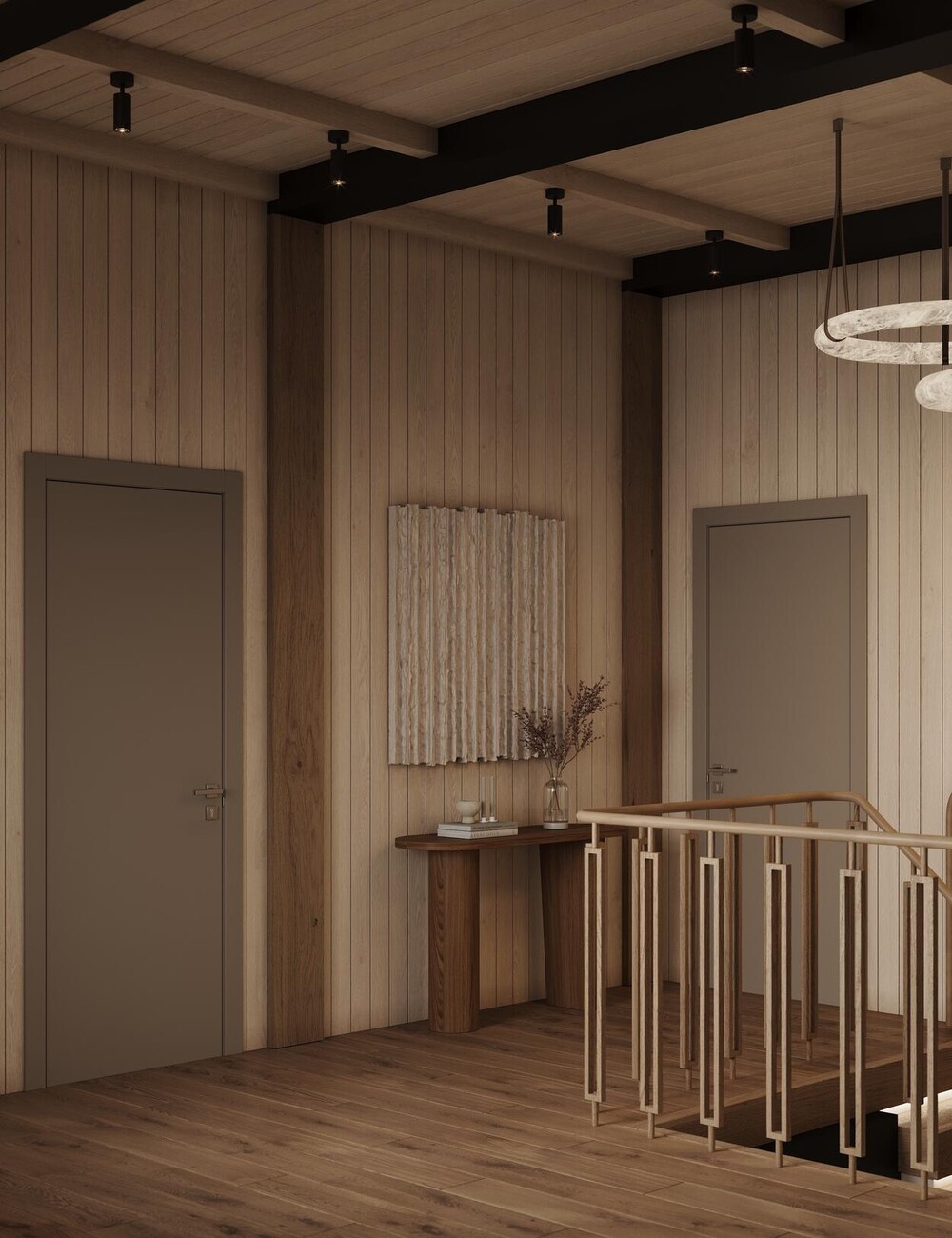 Холл второго этажа продолжает эстетику натурального дерева с вертикальной обшивкой стен и открытыми потолочными балками. В центре пространства расположена лестница с ограждением из тонких деревянных реек и округлым поручнем.