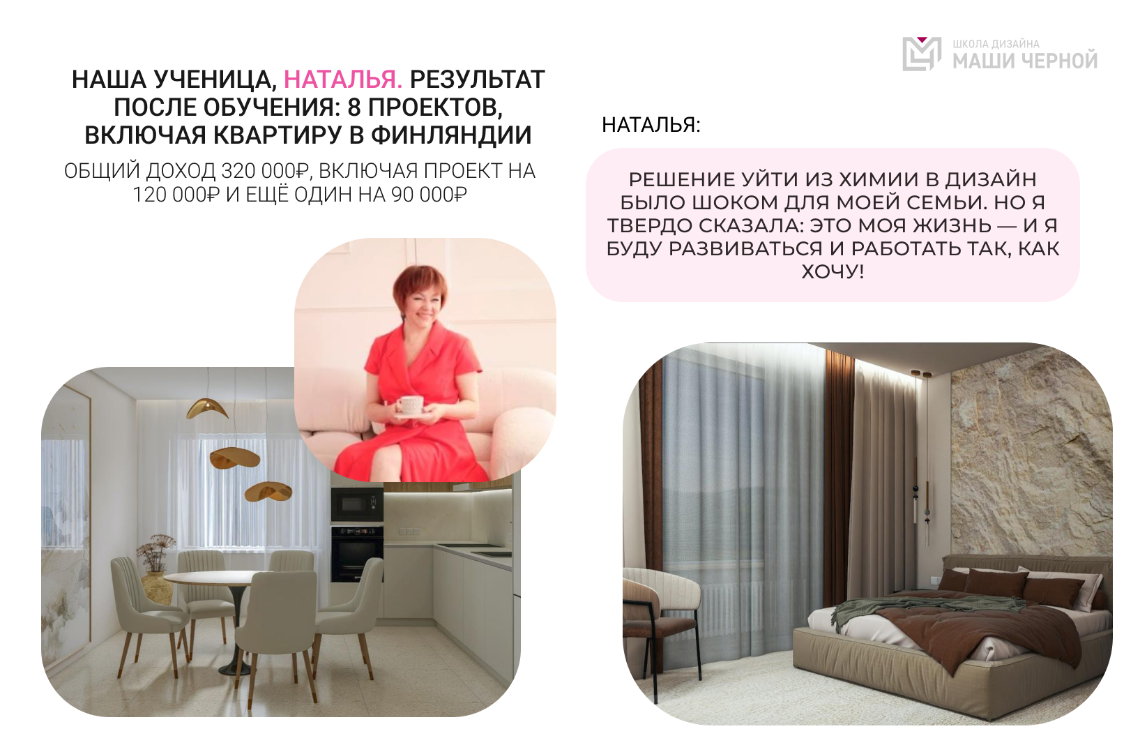 Это подтверждает и пример Натальи, которая в 50 лет сменила должность руководителя химической лаборатории на творческую специальность, связанную с созданием интерьеров.