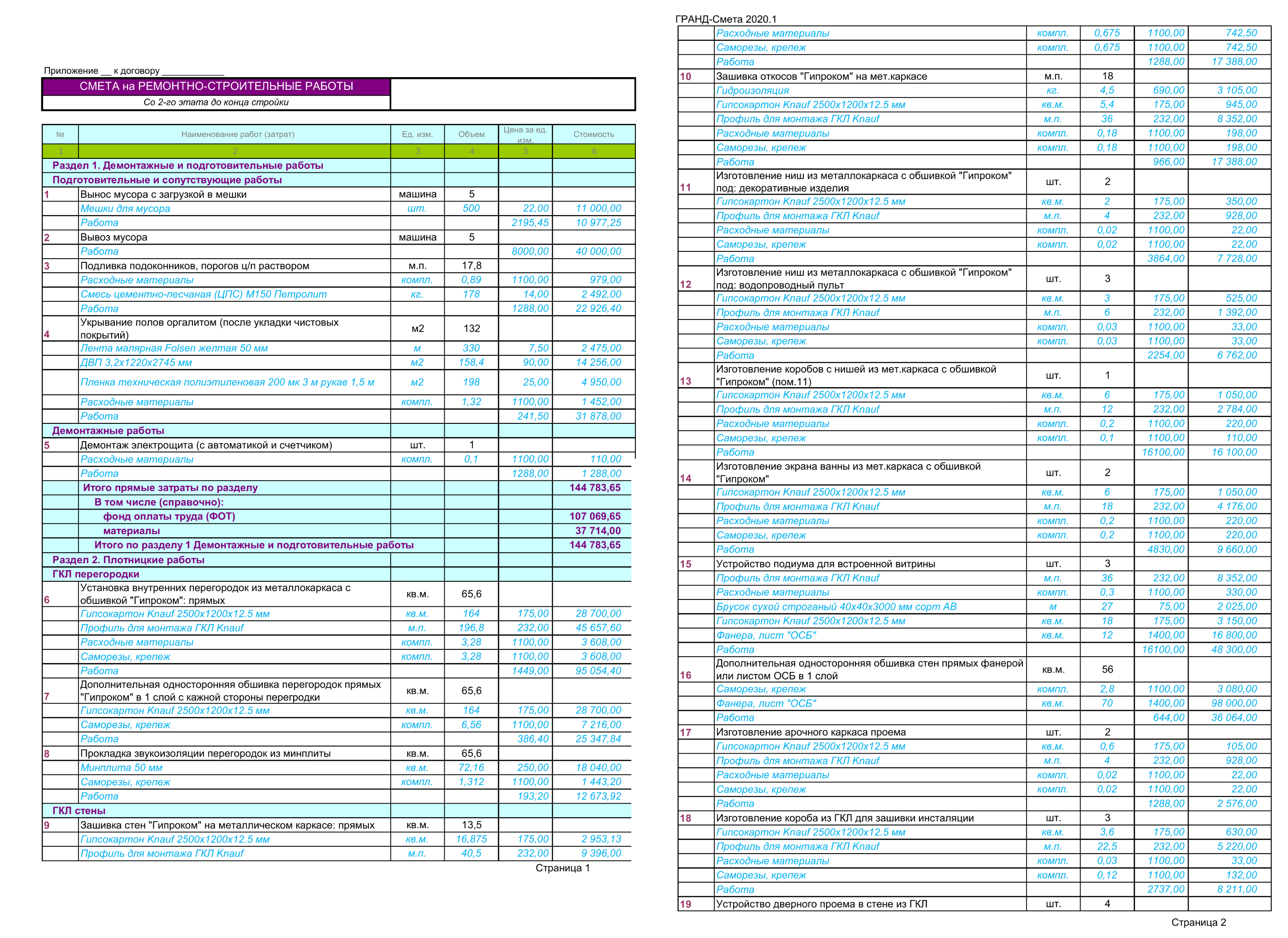 Подготовка и демонтаж. Стяжка, перегородки, обои, сантехника. Вывоз мусора прописывают отдельно, с указанием объема и способа.