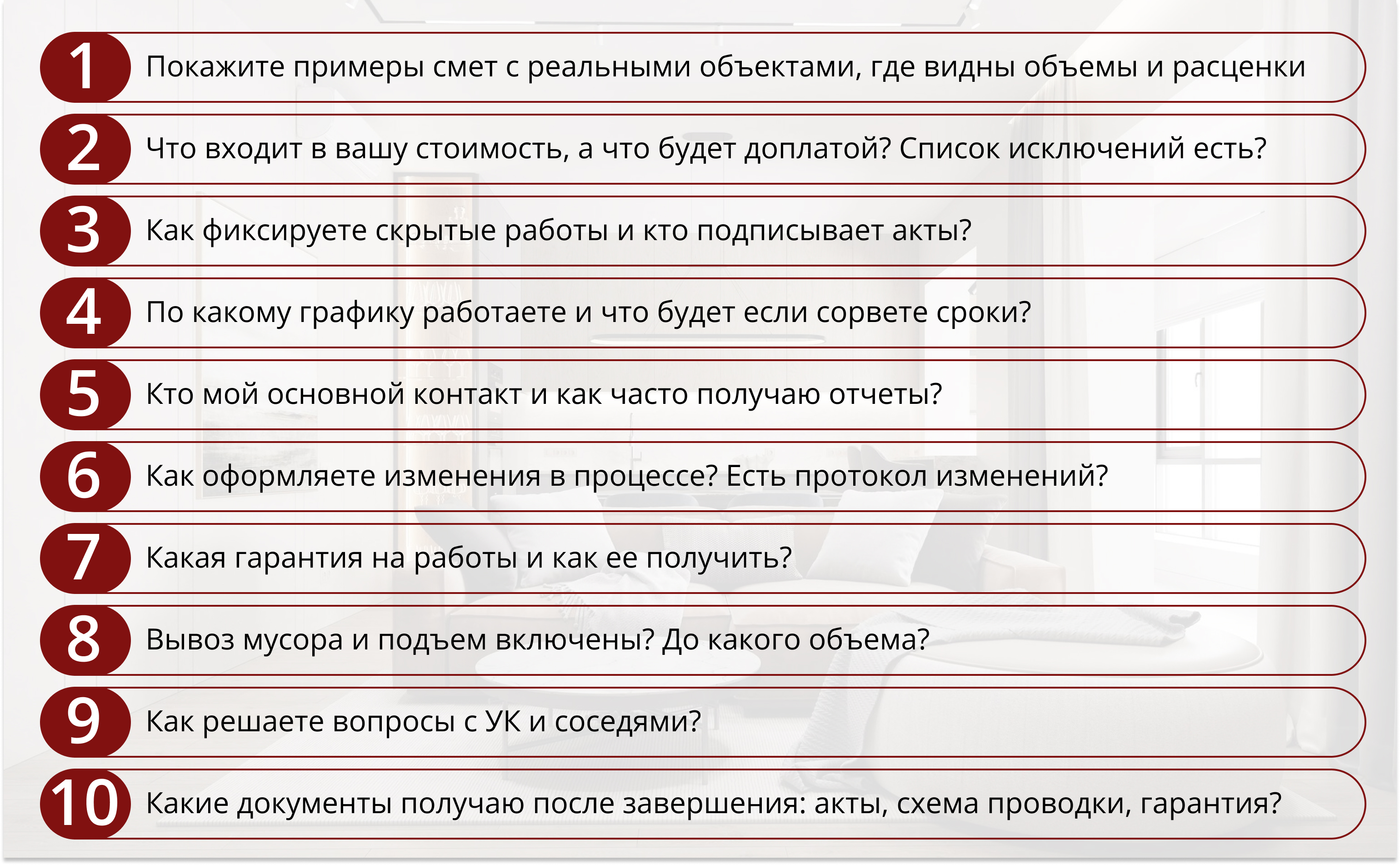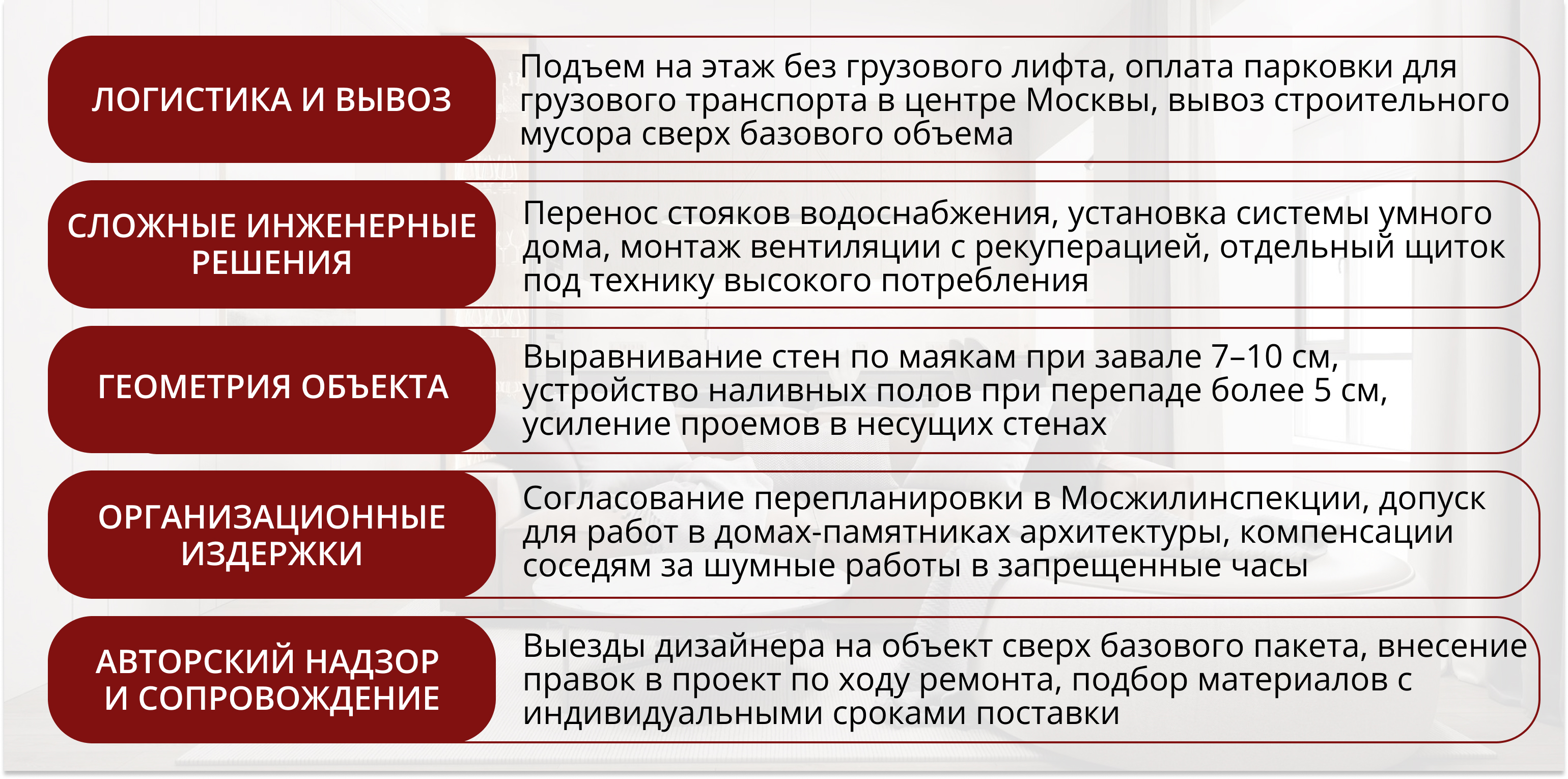 Исключения. Что не входит в итоговую сумму ремонта. Стандартный список исключений: вывоз строительного мусора сверх определенного объема, подъем без грузового лифта, согласования в УК, авторский надзор, премиальные коллекции.