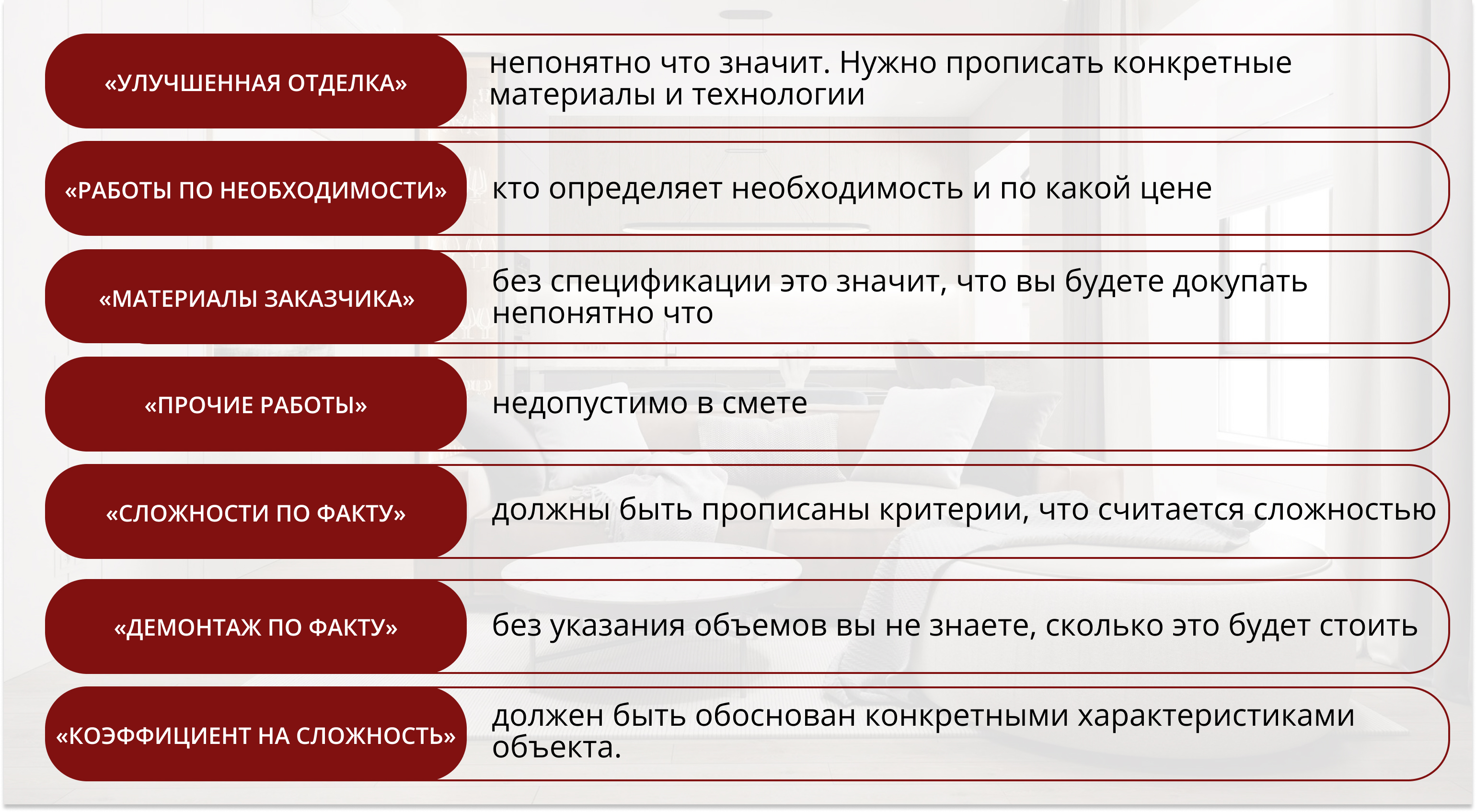 Прочие работы. Если подрядчик не знает, что делать, то как рассчитает бюджет на ремонт? Каждая позиция должна иметь название. «Прочие» — это лазейка, чтобы потом выставить доплату за то, что вы считали уже включенным.