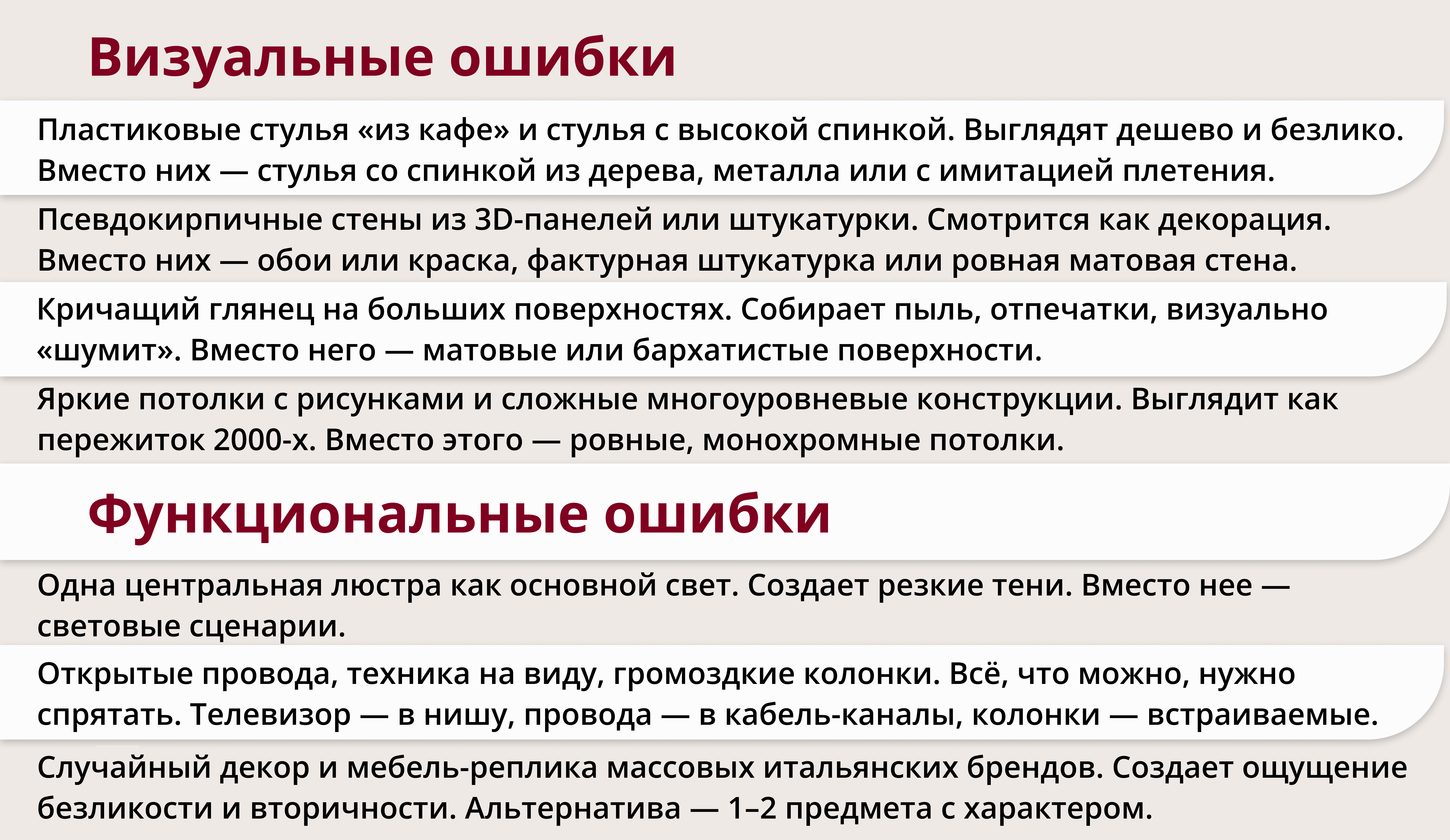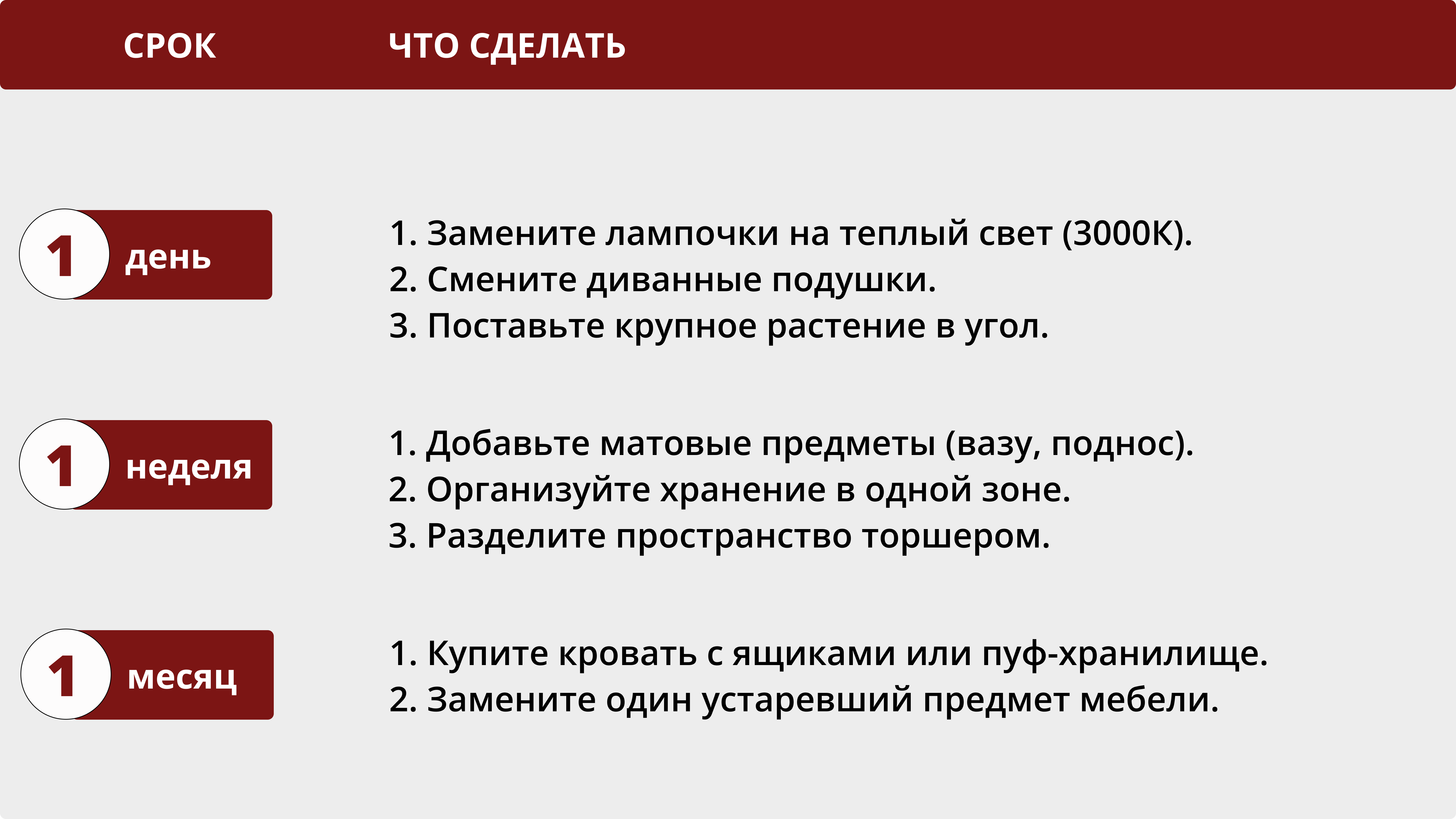 Расставляйте приоритеты: сначала свет, затем хранение и порядок, потом отделка дома, и в конце — декор. С таким подходом вы создадите долговечный интерьер.