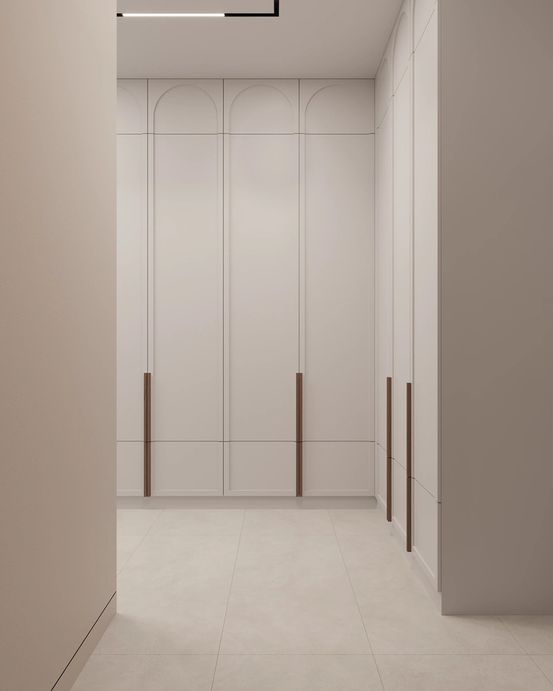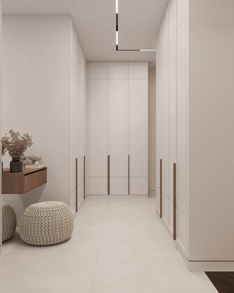 Мы расширили коридор, чтобы избавиться от ощущения тесноты, и разместили вдоль стен встроенные шкафы до потолка. Здесь хранятся верхняя одежда, обувь и сезонные вещи — всё закрыто аккуратными фасадами в светлых тонах.