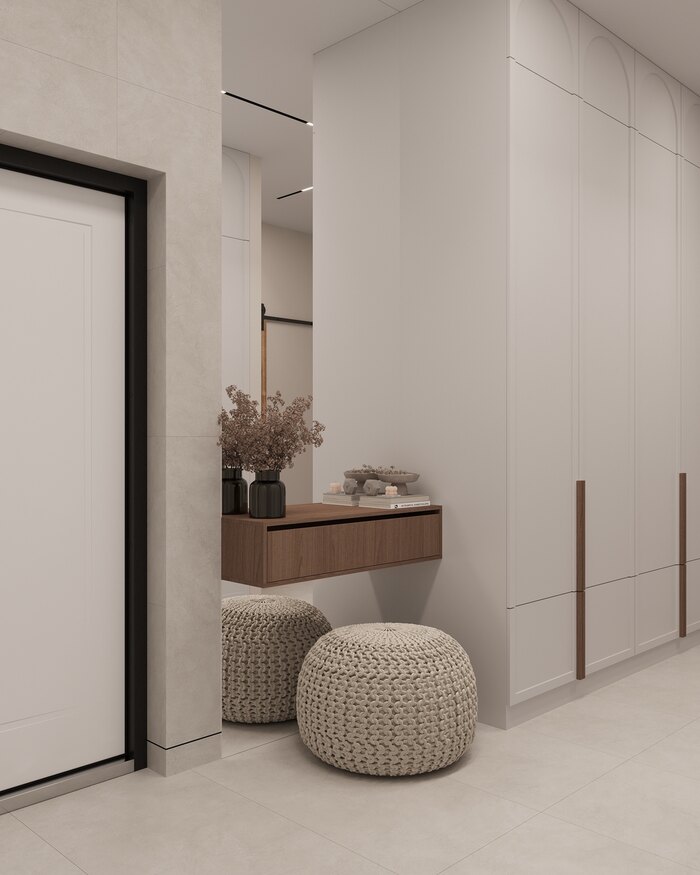 У входа предусмотрена ниша с банкеткой, где удобно присесть, переобуться или отложить одежду. Благодаря продуманной ширине прохода можно свободно перемещаться вдвоём.